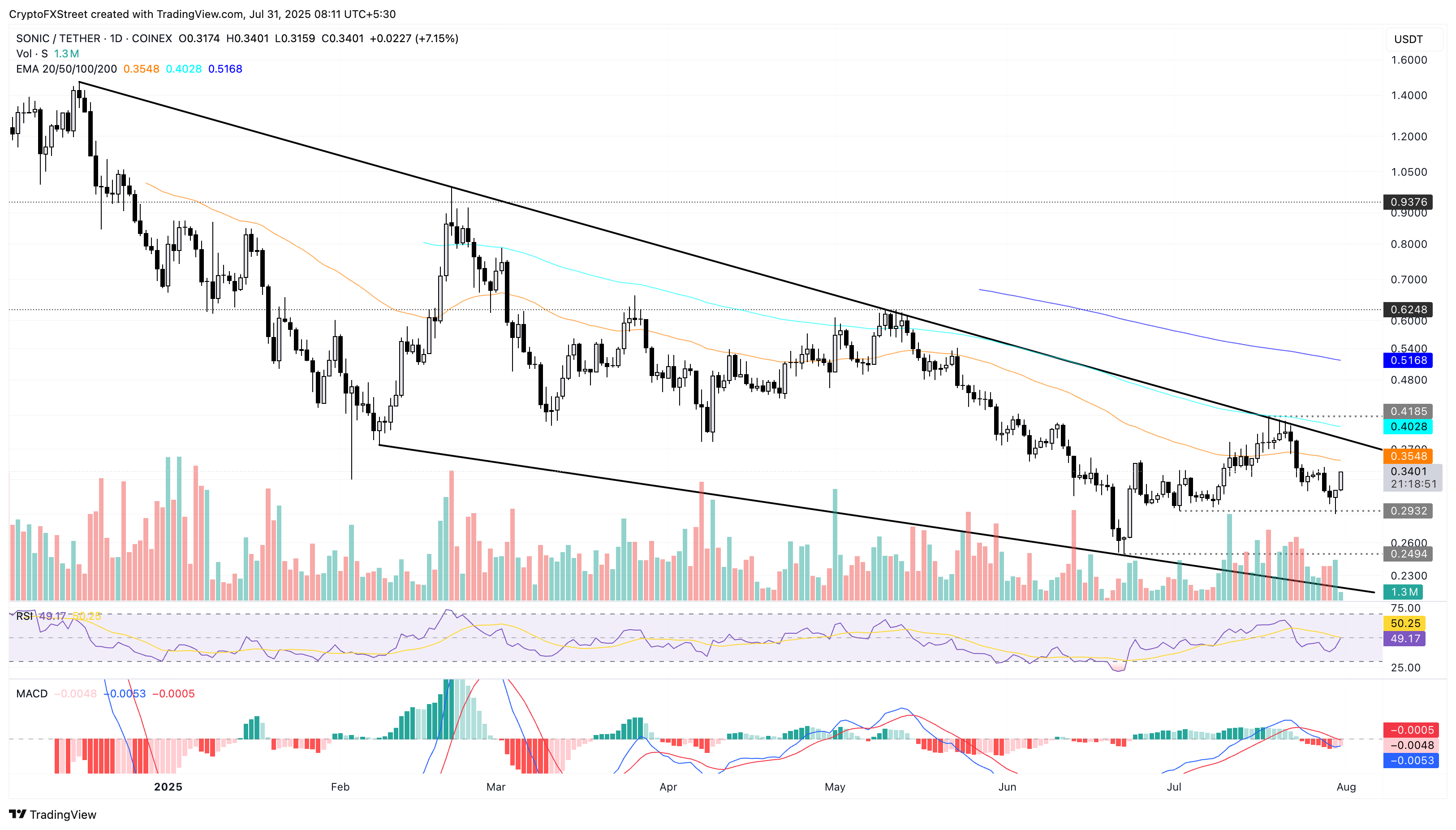 Sonicの逆転は、50日EMAの0.3548ドルを再テストし、その後、下方の日足チャートで共有されている下降ウェッジパターンの上部トレンドライン、0.3700ドル付近に接近する可能性があります。