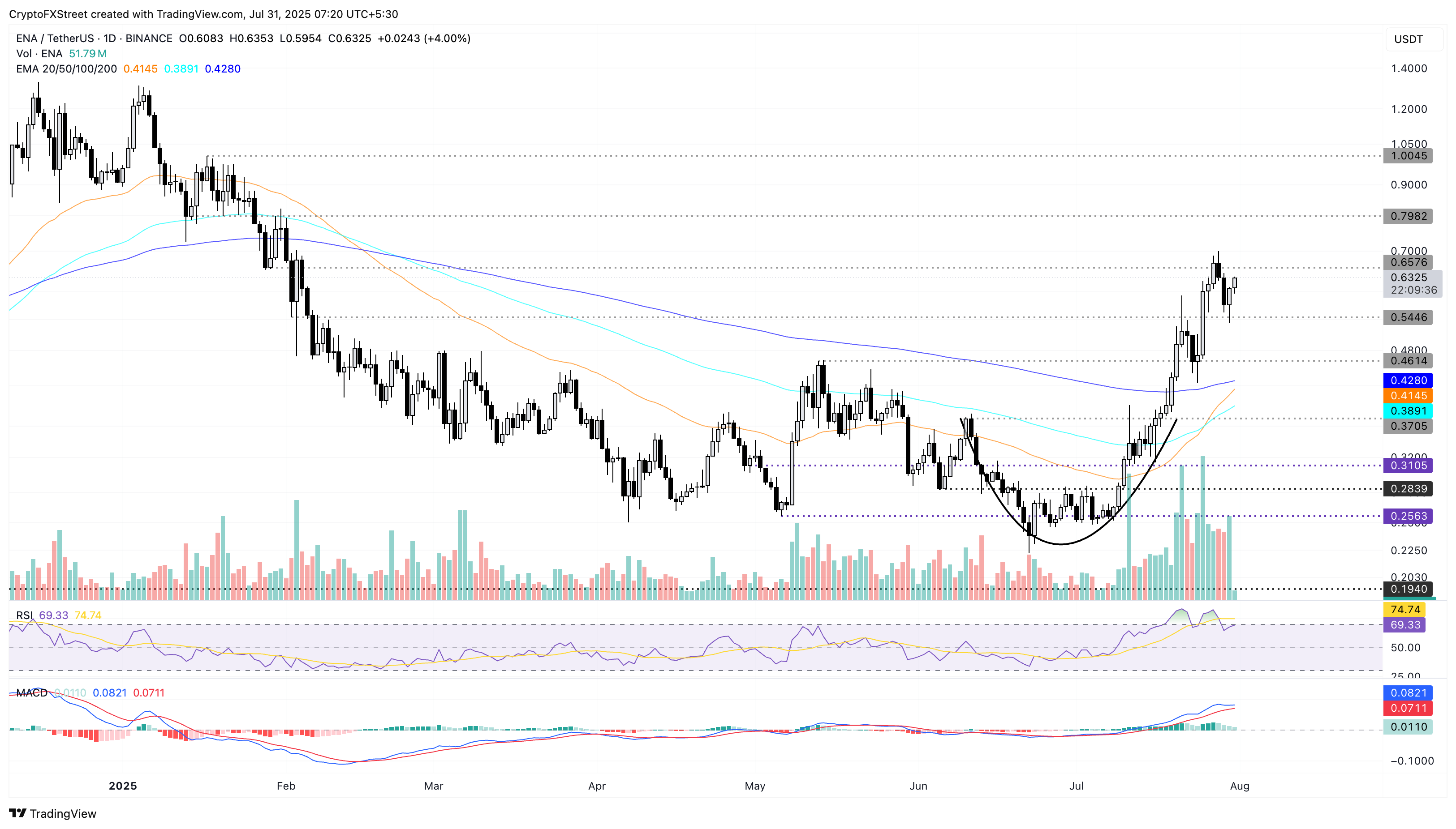 上昇トレンドを確固たるものにするために、ENAは0.6576ドルの週のレジスタンスの上に確定的に収まる必要があり、これによりポンプが1月31日の最後のテストでの0.7982ドルのレベルまで継続する可能性があります。
