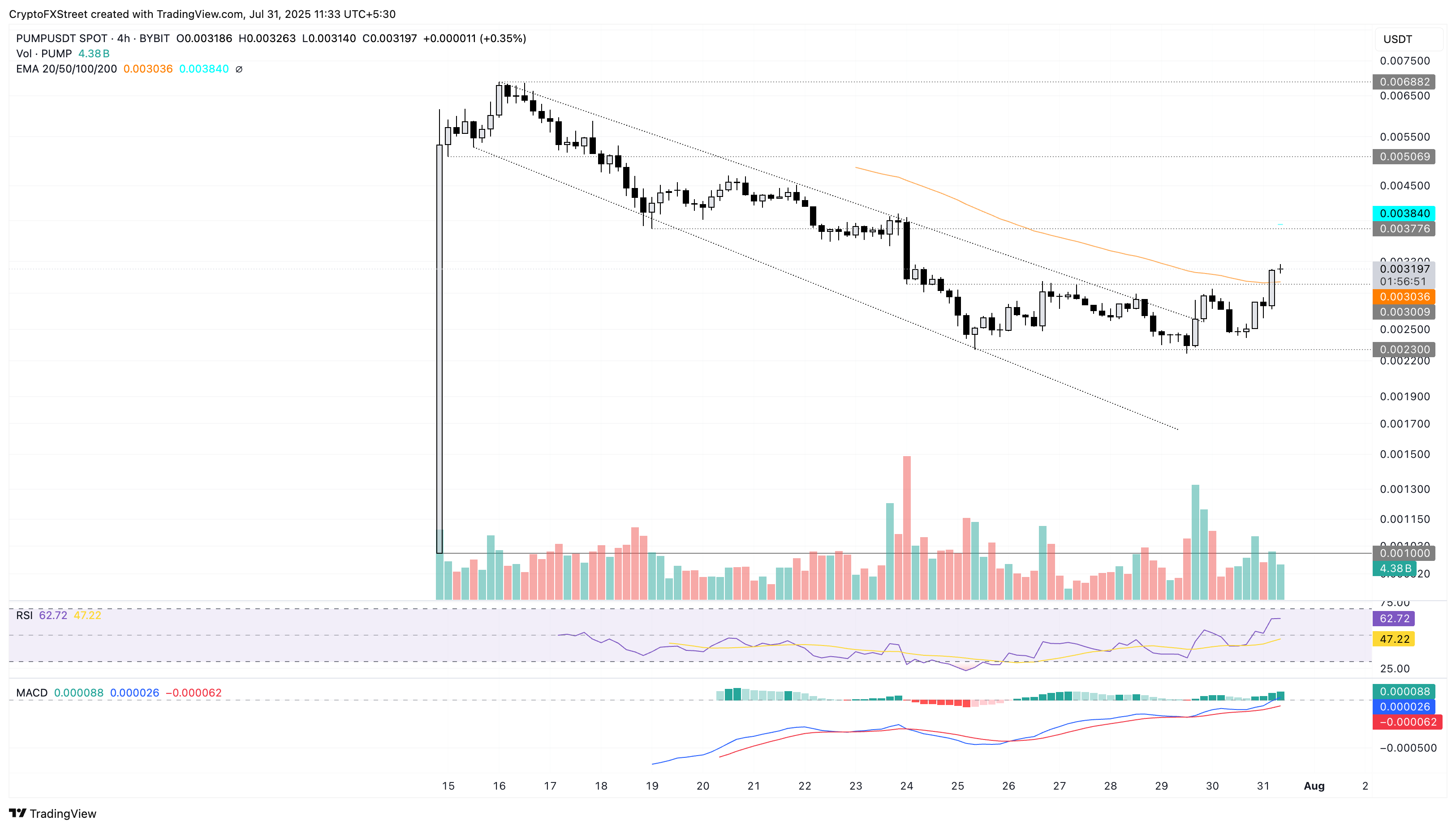 木曜日(7月31日)発表時点で、PUMP価格は15%上昇し、4時間の価格チャートの上下の下落チャネルを突破した勢いを維持しています。反発の勢いは0.0030ドルの水準を超え、この水準は整理範囲を形成し、下支えとなるのは0.0023ドルです。