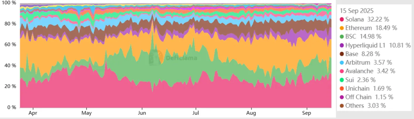 分散型取引所の市場シェア | 出典: DefiLlama9月に、ソラナはイーサリアムを抜いてDEX分野をリードするブロックチェーンとなり、取引量は121.8億USDに達しました。これはBNBチェーンに比べて90%以上高いです。この分野の支配は重要な意味を持ちます。なぜなら、大量の取引は高い手数料を伴い、それによってSOLの再利用の需要を促進するからです。