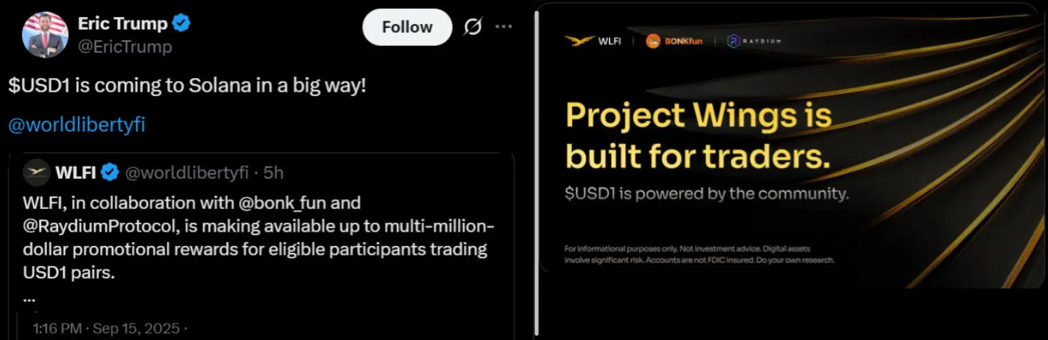 同日、アメリカ合衆国大統領ドナルド・トランプによって支援されている暗号通貨プロジェクトWorld Liberty Financial (WLFI)は、ソラナ上のメモコインプラットフォームBonk.funおよびDEXレイディウムと提携し、数百万ドル相当のプロモーションパッケージを展開することを発表しました。このキャンペーンは、トークンWLFIがUSDおよび現金同等物で完全に裏付けられているとされるUSD1のステーブルコイン取引ペアに焦点を当てています。