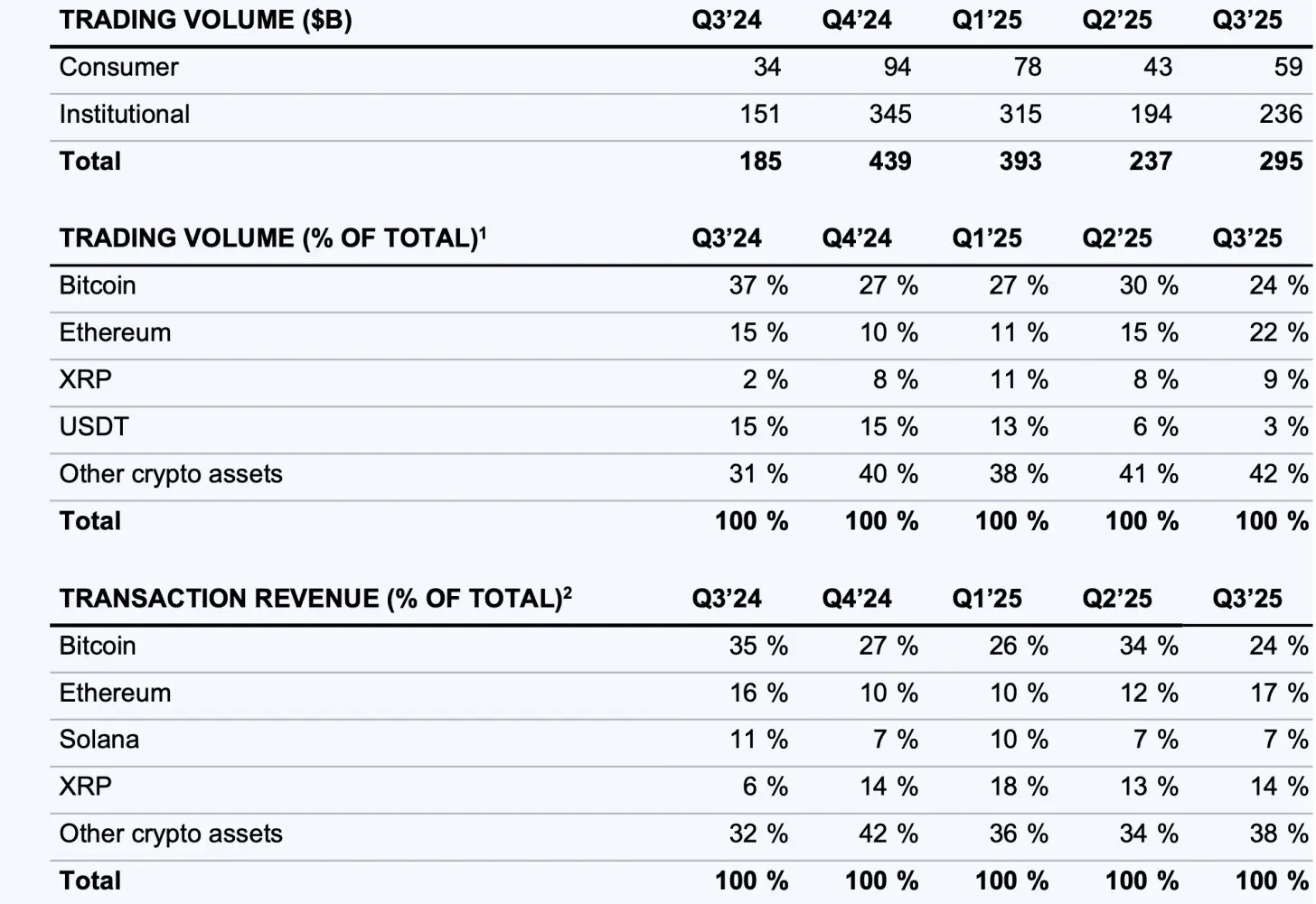 受整体市场上涨的推动,加密货币交易活动在第三季度强劲反弹。全球现货加密货币交易量环比增长约38% ,Coinbase的总交易量达到2950亿美元(环比增长24% )。值得注意的是,Coinbase的零售交易增长速度超过了市场平均水平,这表明扩大的资产列表和改善的用户体验吸引了更多用户参与。交易结构向山寨币倾斜:比特币在Coinbase第三季度的交易量中占比24% (低于第二季度的30%以上),以太坊升至22% ,瑞波币升至9% 。其他加密资产的交易量占比42% ,反映出新上市的长尾代币的受欢迎程度。相应地,交易收入不再那么依赖比特币(比特币交易收入**占比24% ,低于第二季度的34% ),而是更多地来自以太坊(占收入的17% )和瑞波币(占收入的14%)**等资产。衍生品交易成为一大主题。