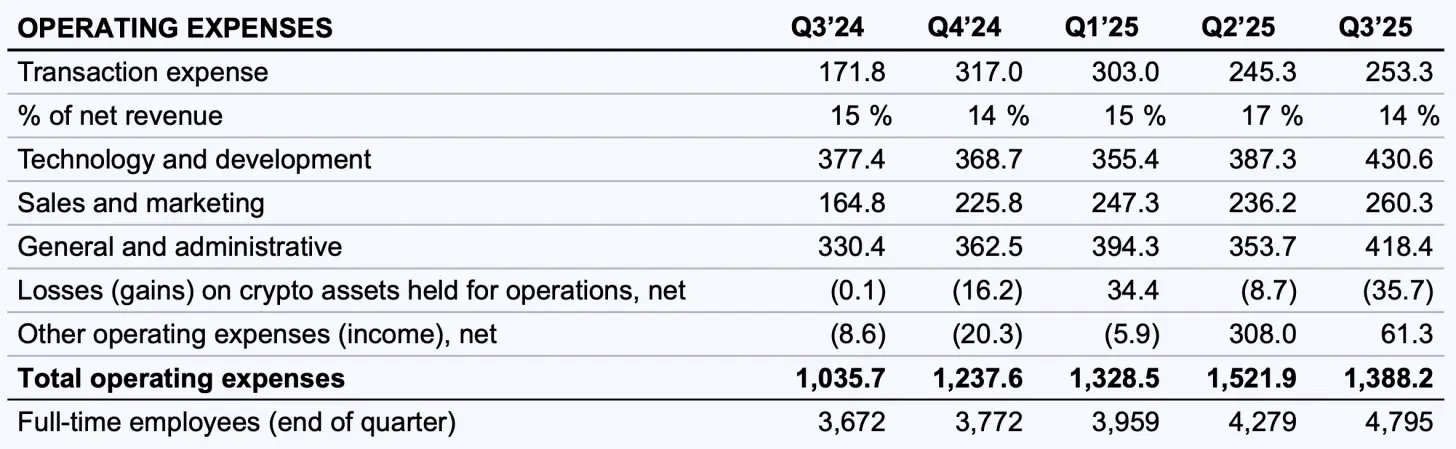 Coinbase在第三季度展现出更佳的成本控制能力。运营支出为14亿美元,环比下降9% ,这得益于此前重组工作的推进以及没有出现大额一次性费用,从而降低了成本运行率。值得注意的是,技术、开发和一般管理费用环比增长14%至11亿美元,主要原因是员工人数增加(环比增长12%至4795名全职员工)以及与USDC余额激增相关的USDC奖励支出增加。该数据还包括新收购的Deribit业务产生的约3000万美元成本,并反映了在****2023年裁员之后,公司在增长领域重新开始招聘的情况。