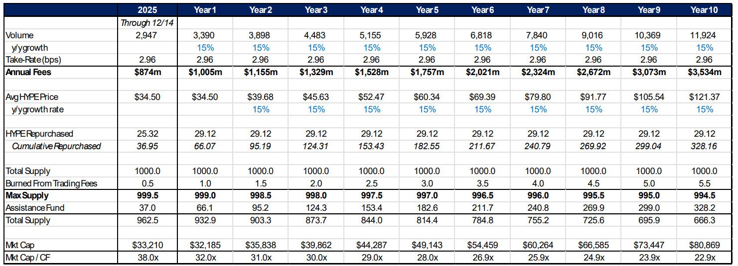 "すべての手数料がトークン保有者にバイバックを通じて返還されるという事実を考慮すると、HYPEは2035年までに50倍に近い価格で取引されるべきだと主張します。"と、12月16日に発表された研究ノートで会社は書いています。
