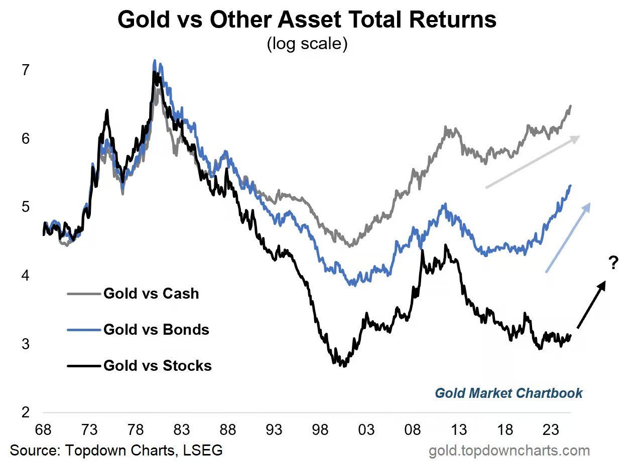 最新のデータによると、金の現金(Cash)に対する価格は1980年の歴史的極値を超えました。これは法定通貨に対するハードカレンシーの購買力が崖のような下落を経験していることを示しています。しかし、それでも他の主要資産に対して、金は「半山腰」にあります。過去2年間、金のリターンはほぼ垂直の角度で株式、債券、現金を圧倒しました。しかし、これはバブルではなく、「平均回帰」の始まりです。株式や債券に対して、金の価格は1980年のピーク値に対してそれぞれ50%と17%低いままです。