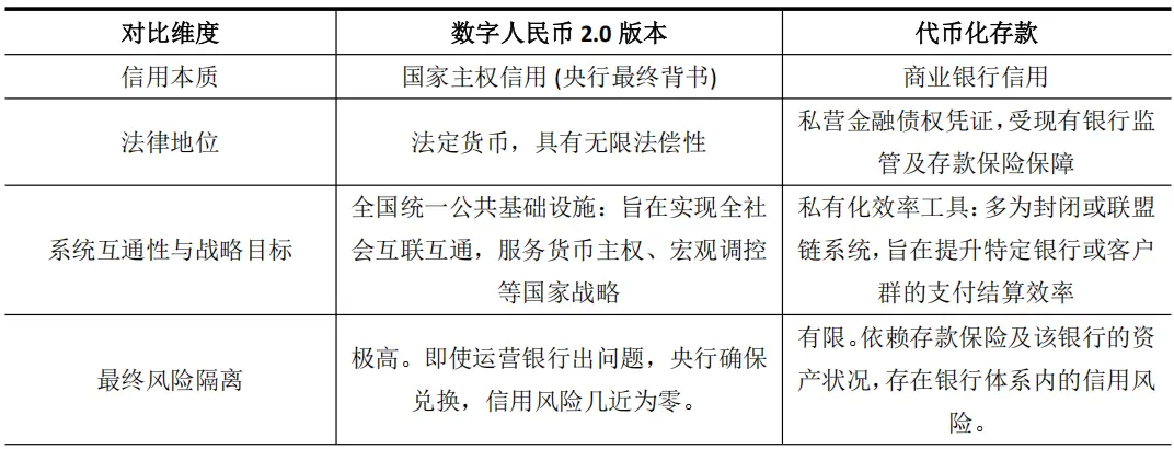 デジタル人民元2.0は、その利息付与と銀行運営の特徴から、商業銀行が推進するトークン化預金に類似している。後者は銀行預金をブロックチェーン上のデジタル証憑(例:JPモルガンのJPM Coin)にしたもので、機関間の決済効率を向上させることを目的としている。しかし、この類似性は表面的なものであり、信用の根底と戦略レベルには本質的な違いが存在する。