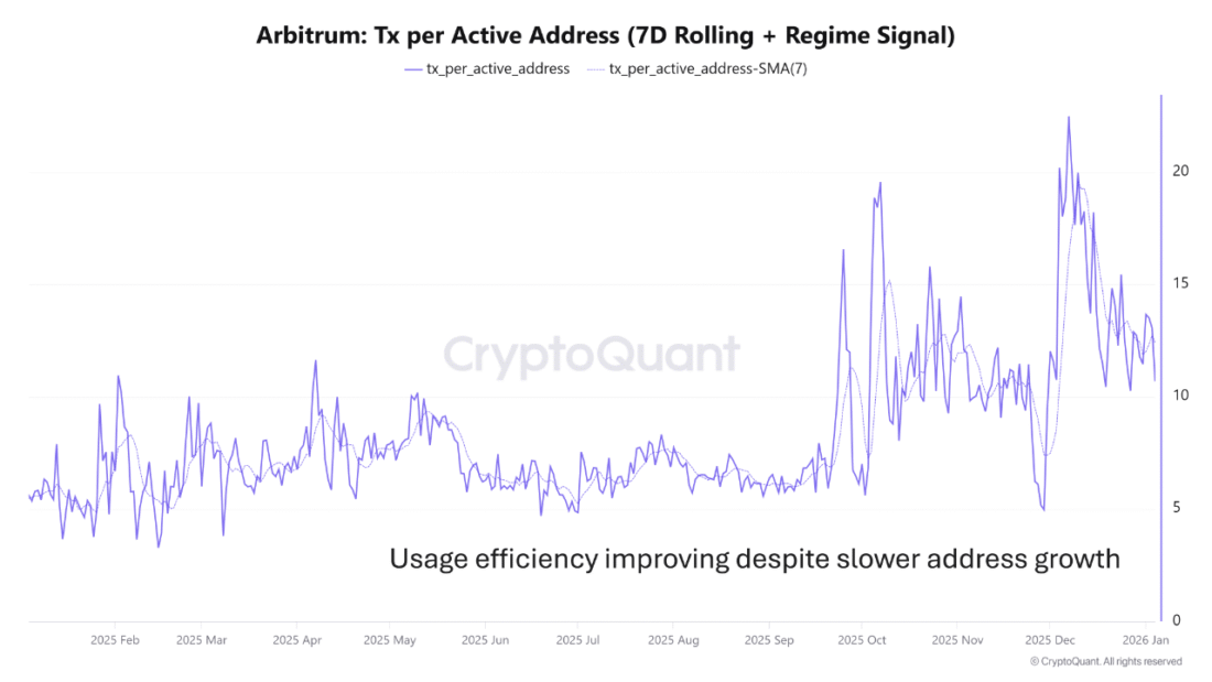 CryptoQuantによると、アクティブアドレスあたりの取引数は指数関数的に増加しました。7日間のローリング指標は2025年初めに5-7の間を行き来し、Q4では15を超える二桁の結果を記録し続けました。