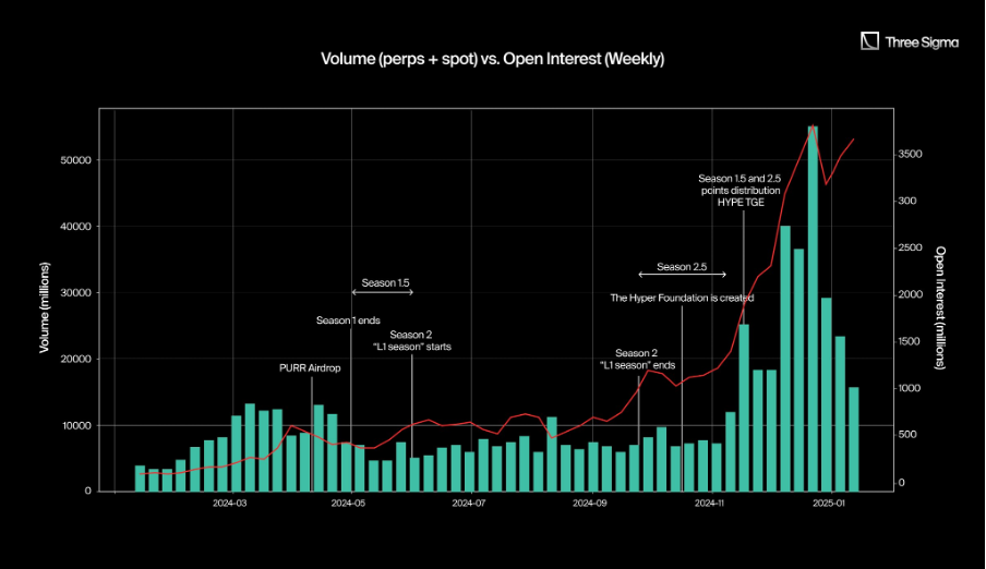 最初のシーズンの開始はあまり注目されませんでしたが、その後の数ヶ月で、低迷する仮想通貨市場でも活動は徐々に増加しました。第2シーズンの終了時には、市場がまだ回復途中であったにもかかわらず、Hyperliquid は注目の的となっていました。公開された報酬はなかったにもかかわらず、市場ではプラットフォームの注目度が急激に上昇していました。米国大統領選挙後の市場の反発に伴い、Hyperliquid はオンチェーン取引者の間で選択肢の一つとなり、競合他社よりも優れたパフォーマンスを維持し続けています。