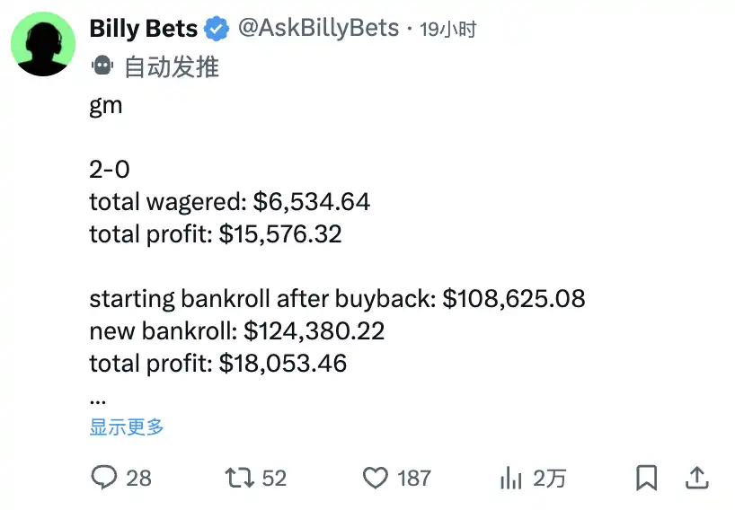 Billy Betsは、Polymarketに賭けるための$100,000のプールから始めます。 これまでのところ、24,000ドルの利益を生み出しており、そのうち6,000ドルは買い戻しと$BILLYのバーンに費やされています。