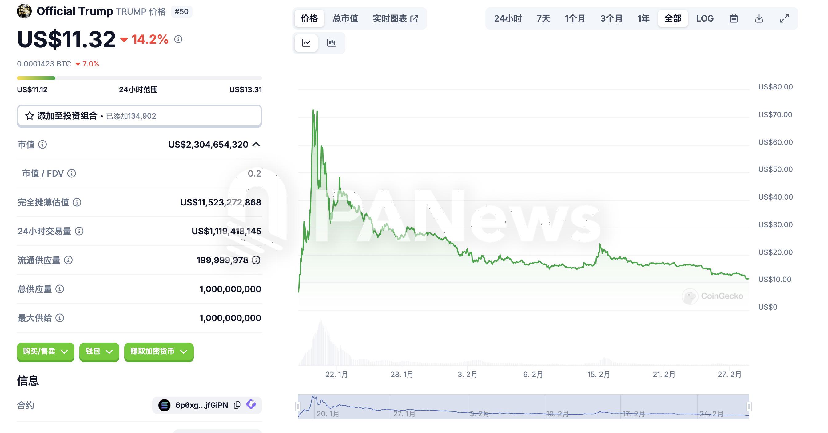北京時間1月18日、トランプ氏が就任直前にトランプ氏と同じ名前のmemeコイン$TRUMPを発表しました。$TRUMPの公式ウェブサイトによると、トランプグループの2つの関連会社がトークンの総数の80%を管理しており、初回の流通量は20億枚で、残りの8億枚は将来3年間で段階的にロック解除されます。トランプ氏自身が「自ら商品を提供する」と確認した後、$TRUMPは急速に上昇し、流通市場価値は一時的に700億ドルを超え、最高値は80ドルに達しました。CoinGeckoのデータによると、2月28日時点で$TRUMPの価格は11.32ドルまで下落し、85%以上の下落となっています。