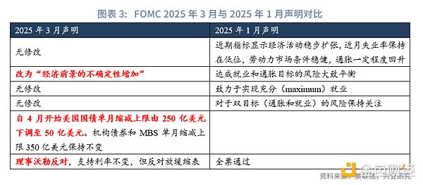 今回の金融政策決定会合の声明には、明らかな変更が1点あり、「雇用とインフレ目標の達成リスクは大体均衡している」という文言が削除され、「経済見通しの不確実性が増加している」となりました。4月から米国債の月間縮減上限は250億ドルから50億ドルに引き下げられました。機関債券とMBSの月間縮減上限350億ドルは変更ありません。今回の四半期経済予測では、3年連続の経済成長予測が下方修正され、今年の失業率が0.1%引き上げられ、PCEおよびコアPCEの予測がそれぞれ0.2%、0.3%引き上げられ、関税によるスタグフレーションリスクを反映しています。ドットチャートの中心は変わらず、委員たちの予想は1~2回の利下げ(25~50bp)に集中しており、市場の予想に近いものとなっています。
