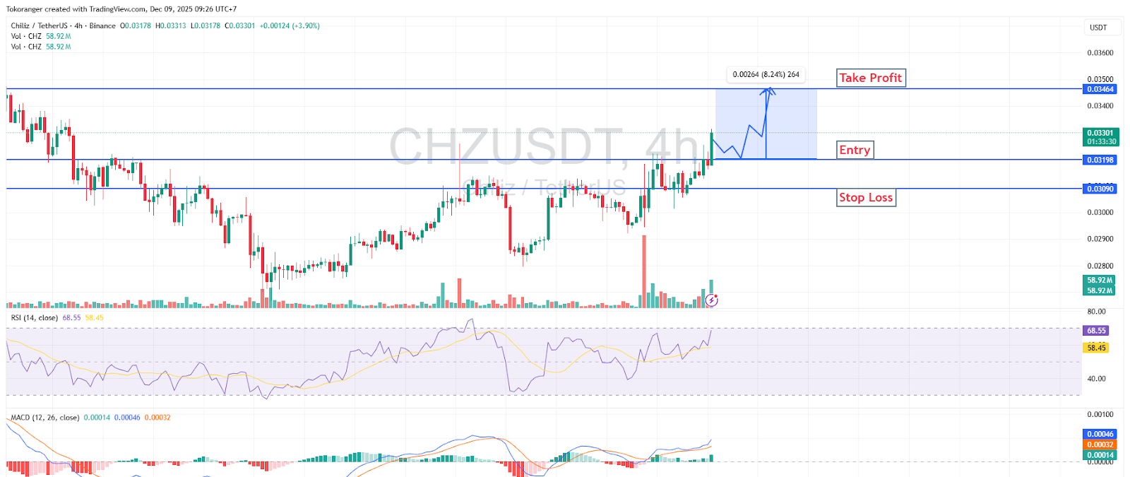 CHZは$0.03198の需要ゾーンから回復し始めており、買い手が勢いを取り戻す兆候を示すパターンを形成しています。小さなブレイクが構造のサポートを超えると、リテストとリバウンドを経て、強力なレジスタンス$0.03464(テイクプロフィットエリア)へ向かう可能性があります。エントリーレベルの$0.03198を維持し、サポート$0.03090を割らなければ、上昇シナリオは有効です。RSIは上昇中でブルッシュゾーンに近づき、MACDもポジティブなモメンタムを示しています。