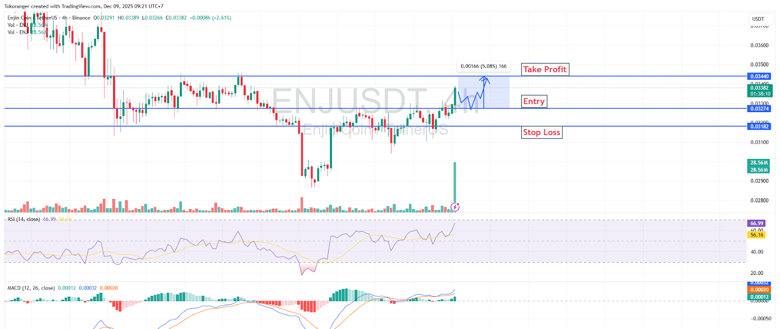 Source: TokocryptoBlogOriginal Title: Market Sinyal Kripto: Analisis Teknikal dan Peluang 9 Desember 2025Original Link: **暗号通貨のデイリーシグナル**は、**2025年12月9日火曜日**のための詳細な分析と取引戦略の推奨を含みます。注目は、価格動向に大きな潜在性を示す**3つの暗号資産**に集中しています。この情報は、最新の市場データとテクニカル指標に基づいて編成されており、変化し続ける暗号市場のダイナミクスの中でより適切な意思決定を行うためにトレーダーを支援します。## 過去24時間の出来事:### 1. スタンダードチャータード、The Fedが今週金利を25bps引き下げると予測スタンダードチャータードは、連邦準備制度理事会(FRB)が**水曜日に金利を25ベーシスポイント(bps)引き下げる**との予測を更新しました。**市場への影響:**リスクオンのセンチメントが高まる→暗号資産は強気傾向。### 2. シンガポール、Rippleのグローバル決済ライセンスを拡大シンガポール金融管理局(MAS)は(RippleのMPIライセンスを拡大し、以下のサービスを可能にしました:* 国際間の完全な決済* **XRP**と**RLUSD**の規制サービス**影響:**Rippleのアジアおよびグローバル送金市場での地位をさらに強化。) 3. Stablecoin Tether USD₮、アブダビのADGMでマルチチェーン利用を正式認定アブダビグローバルマーケット(ADGM)は、正式に**USD₮**を彼らの規制体制内でのマルチチェーン利用可能な合法的なステーブルコインとして認定しました。対応ブロックチェーン:**TON、TRON、Polkadot、NEAR**。**影響:**機関投資家によるステーブルコインの採用がさらに強化。### 4. ブラックロック、新たなETF「iShares Staked Ethereum Trust」を申請ブラックロックは公式に**S-1申請書**を提出し、**ステークドイー Ethereum (ETH)**のETFを申請。**影響:**大手機関の流動性がイーサリアムエコシステムに流入する可能性→ETHにとって非常に強気。### 5. Vitalik Buterin、イーサリアムのためのオンチェーンGas Futures Marketを提案Vitalikは、ガスコストの変動に対してヘッジを行うためのオンチェーン*gas futures*メカニズムの提案を行いました。**影響:**採用されれば、ETHの取引コストがより安定し、開発者や企業にとって魅力的になる。---## 3つの暗号資産のテクニカル分析( TRX/USDT )🔼 +2.03%###* **エントリー:$0.2801*** **ストップロス:$0.2773*** **テイクプロフィット:$0.2857**TRXは、急落後に$0.2780-$0.2800のサポートゾーンをテストしています。1時間RSIも売られすぎの領域に低下しており、反発の可能性が高まっています。一方、MACDは下向きに鈍化し始めており、売り圧力の弱まりを示しています。価格が$0.2773以上を維持できる限り、$0.2857のレジスタンスへの回復シナリオが最も妥当です。### ENJ/USDT (🔼 +5.08%)* **エントリー:$0.03274*** **ストップロス:$0.03182*** **テイクプロフィット:$0.03440**ENJ/USDTは、$0.03180-$0.03270の需要ゾーンからの堅実なリバウンドを示しています。高ボリュームのインパルスキャンドルが新たな買い手の参入を示唆しています。このゾーンを維持できれば、抵抗線$0.03440への上昇を継続する可能性が高く、またRSIも中立から回復し、ブルッシュな勢いが再び始まっていることを示しています。MACDも正のカーブを描き始めており、短期的な上昇トレンドの継続性を強めています。( CHZ/USDT )🔼 +8.24%###* **エントリー:$0.03198*** **ストップロス:$0.03090*** **テイクプロフィット:$0.03464**CHZは$0.03198の需要ゾーンから回復し始めており、買い手が勢いを取り戻す兆候を示すパターンを形成しています。小さなブレイクが構造のサポートを超えると、リテストとリバウンドを経て、強力なレジスタンス$0.03464(テイクプロフィットエリア)へ向かう可能性があります。エントリーレベルの$0.03198を維持し、サポート$0.03090を割らなければ、上昇シナリオは有効です。RSIは上昇中でブルッシュゾーンに近づき、MACDもポジティブなモメンタムを示しています。---**取引を行う前に、全体的な分析を必ず行ってください。****免責事項:**暗号資産投資は高リスクを伴い、ご自身の判断と調査に基づいて行動してください。推奨や情報提供はあくまで参考であり、売買を促すものではありません。