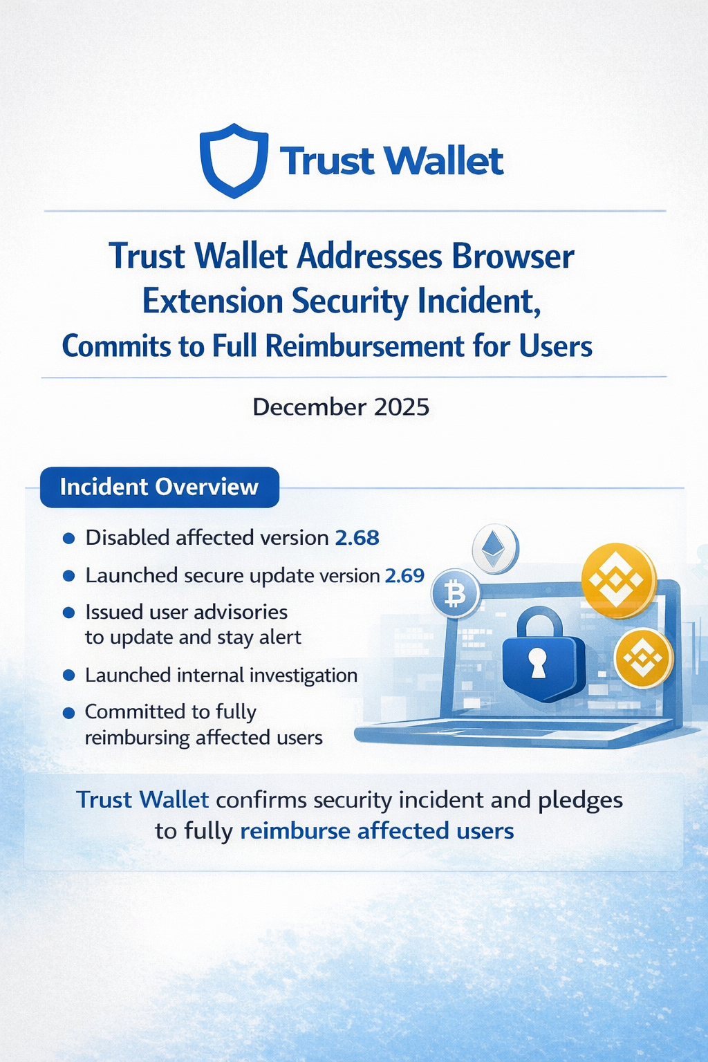 2025年12月Trust Walletは本日、Chromeブラウザ拡張機能の更新に関するセキュリティインシデントを確認し、影響を受けたすべてのユーザーに対して完全な補償を発表しました。インシデントは迅速に特定、封じ込められ、解決されており、Trust Walletのモバイルアプリや他の拡張機能バージョンには影響ありませんでした。### インシデント概要2025年12月24日、Trust Walletは**バージョン2.68**のChromeブラウザ拡張機能に関連する異常な活動を検知しました。調査の結果、悪意のあるコードがアップデートに導入されており、ユーザーが拡張機能を解除した際に機密ウォレットデータへの不正アクセスを可能にしていたことが判明しました。この問題は、Chrome拡張機能のバージョン2.68に限定されていました。Trust Walletのモバイルアプリやその他のブラウザ拡張機能のバージョンは安全で影響を受けていませんでした。### 迅速な対応と封じ込め問題を確認した後、Trust Walletは以下の措置を取りました:直ちに影響を受けた拡張機能のバージョンを無効化公式Chrome Web Storeを通じて安全なアップデート(**バージョン2.69**)をリリースユーザーに対し、危険なバージョンを無効化し、アップグレードするよう公的にアドバイス公式修正を装ったフィッシングサイトに対して警告インシデントの根本原因を調査する内部調査を開始###Trust Walletはまた、インシデントによる**確認された損失を全額補償**することを確認しました。### 範囲と影響予備的な推定によると、問題が封じ込められる前に、複数のブロックチェーンにまたがるデジタル資産約**700万米ドル**が影響を受けていました。Trust Walletは、資金の追跡と内部セキュリティ強化のためにブロックチェーン調査官やセキュリティパートナーと緊密に連携しています。**セキュリティへのコミットメント**「ユーザーのセキュリティは私たちの最優先事項です」とTrust Walletは述べています。「このインシデントは高度に洗練されたサプライチェーン攻撃を伴いましたが、私たちのチームは迅速に行動し、ユーザーを保護し、問題を解決し、影響を受けたすべてのユーザーに補償を行いました。」Trust Walletは、コードレビューの強化、展開アクセス制御の厳格化、リアルタイム監視の改善など、追加のセキュリティコントロールを導入し、開発とリリースのプロセスをさらに強化しています。### ユーザー向けガイダンス### Trust Walletはユーザーに対し、以下を推奨します:**バージョン2.69以降**のChrome拡張機能を使用していることを確認シードフレーズをオンラインで共有または入力しないこと大きな残高にはハードウェアウォレットやコールドストレージを使用セキュリティインシデント後のフィッシング詐欺に注意影響を受けたと思われるユーザーは、公式チャネルを通じてTrust Walletサポートに連絡することを推奨します。###今後の展望###Trust Walletは、透明性の維持、継続的な改善、ユーザー資産の保護に引き続き取り組んでいます。詳細なインシデント後のレビューを公開し、調査結果や教訓を広く暗号通貨コミュニティと共有します。**Trust Walletについて**Trust Walletは、世界中の何百万ものユーザーをサポートする主要なセルフカストディ暗号ウォレットです。ユーザーは、複数のブロックチェーンにわたって安全にデジタル資産を保存、送信、受信、管理でき、完全なプライベートキーのコントロールを維持します。#CryptoNews#SecurityUpdate#CryptoAlert#BreakingCryptoNews