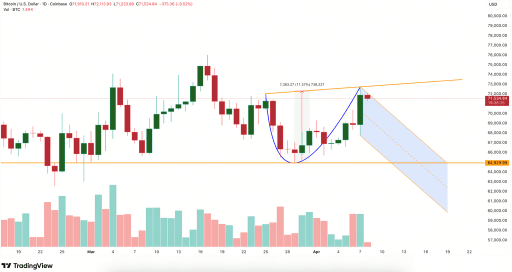 2026 年 3 月下旬から 4 月 7 日にかけて、ビットコイン価格は日足レベルで標準的なカップ・アンド・ハンドル形状の構築を完了しました。この形状は、弧を描く「カップ本体」と、小幅な調整から成る「ハンドル」で構成されています。カップ本体の形成は 3 月下旬における市場が利益確定売りを消化した後の回復反発に対応し、一方ハンドルは 4 月 7 日の高値からの小幅な下落を反映しています。