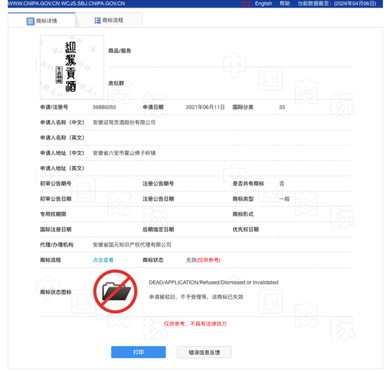 ブルームバーグニュースの記者が国家知的財産権局 商標局の情報を調べたところ、迎駕貢酒のエコ・洞蔵商標については、出願が却下され、受理されないなどの表示があり、その商標は失効していました。