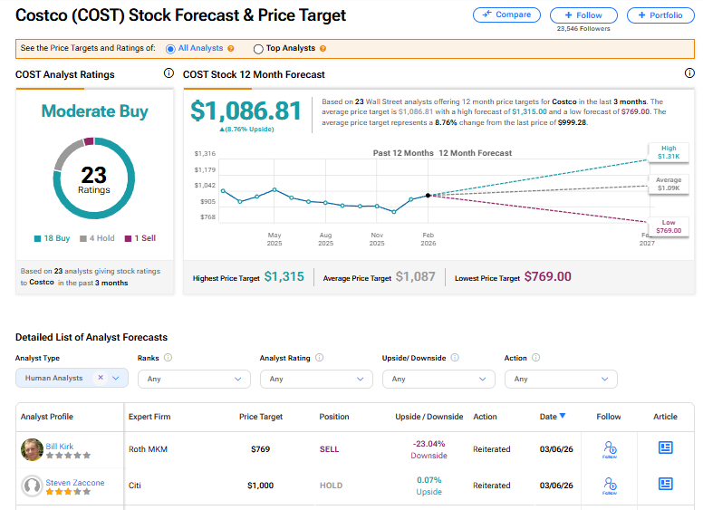 Costco’s stock has a consensus Moderate Buy rating among 23 Wall Street analysts. That rating is based on 18 Buy, four Hold, and one Sell recommendations issued in the last three months. The average COST price target of $1,086.81 implies 8.76% upside from current levels.