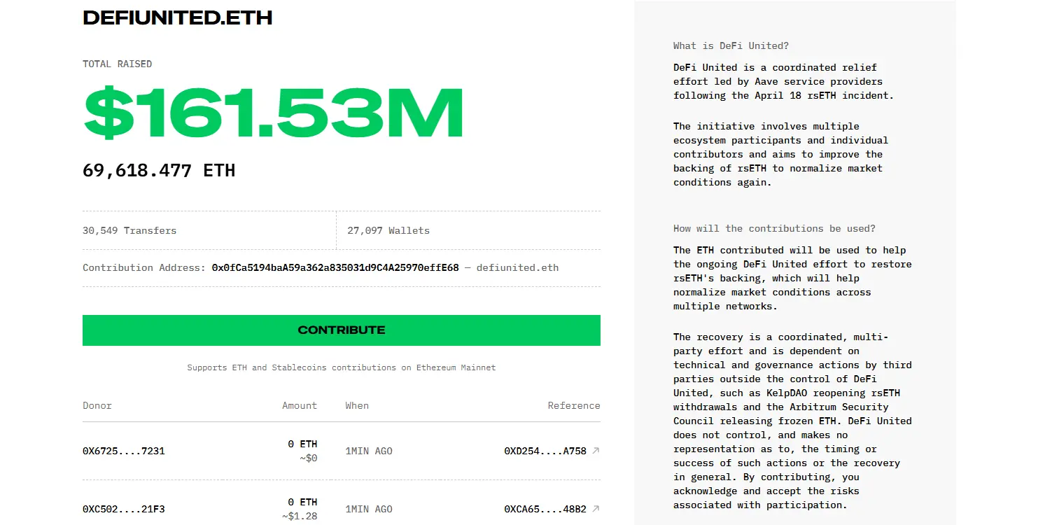 ChainCatcher messages, led by Aave service providers following the rsETH incident on April 18, are part of the DeFi United coordinated rescue effort, which has so far raised a total of $161.53 million (approximately 69,618 ETH). The initiative aims to help restore rsETH collateral support damaged by the Kelp DAO bridge attack and improve liquidity across multiple network markets.