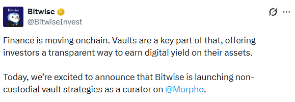 O mercado de empréstimos on-chain consolidou-se como um dos principais verticais do DeFi, graças à sua elevada eficiência de liquidação e execução, bem como à poderosa composabilidade. O valor total bloqueado (TVL) neste segmento situa-se atualmente em cerca de 58 mil milhões $. Recentemente, a Bitwise anunciou o lançamento de um cofre não custodial na Morpho, onde atua como Curador, destacando equipas dedicadas ao desenvolvimento de estratégias e gestão de risco.