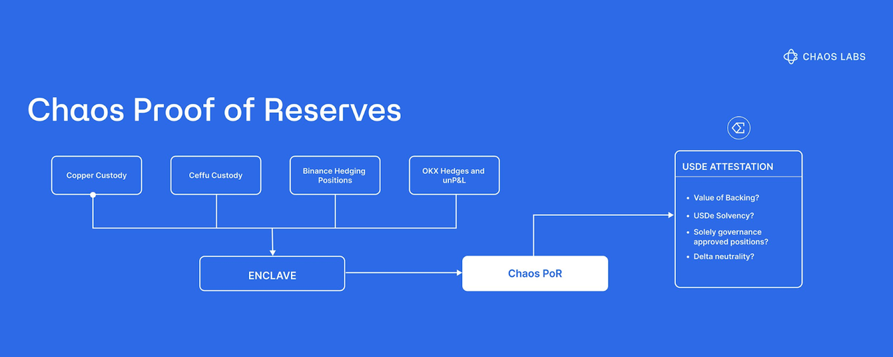 Como resultado, o mercado começou a encarar o PoR (Proof of Reserves) como infraestrutura crítica de controlo de risco. Tomando como exemplo o PoR da Chaos Labs, o seu objetivo é colmatar o pânico de preços causado por lacunas de informação. Após o incidente da Bybit, a Ethena introduziu o Chaos PoR para melhorar a visibilidade e verificabilidade das reservas USDe, ajudando a reduzir liquidações em cascata provocadas por especulação em períodos de volatilidade extrema. Ao nível do mecanismo, o Chaos PoR utiliza verificação automatizada e multinível para monitorizar continuamente três fluxos de dados principais e emitir sinais consumíveis por contratos inteligentes: reservas bloqueadas, oferta emitida e estado de colateralização. Na essência, transforma a questão de saber se as reservas são reais e suficientes de uma narrativa ou divulgação para um input de risco programável, permitindo que protocolos e utilizadores tomem decisões com base em evidências verificáveis em vez de sentimento de mercado. (4)