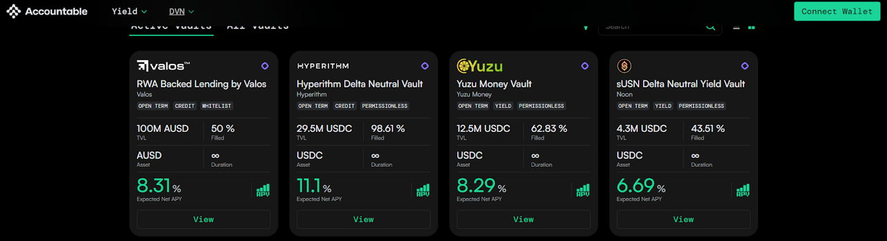 Por esta razão, seguindo a lógica da Tendência 1 (ascensão dos Curadores de Risco), a próxima categoria de ativos suscetível de ser gerida em escala poderá ser a dos cofres multiativos de RWA. Neste modelo, os Curadores são responsáveis por filtrar, subscrever e monitorizar continuamente os ativos, consolidando várias exposições RWA num portefólio gerido ativamente. Com uma única posição, os utilizadores acedem a rendimento real mais diversificado, resiliente e ajustado ao risco.