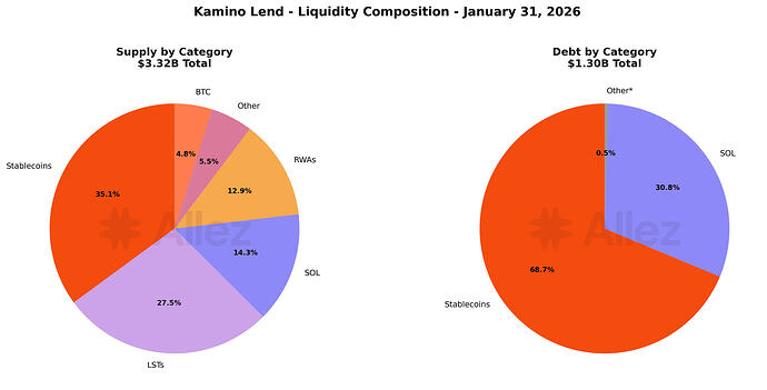 O RWA tornou-se a categoria de crescimento mais rápido da Kamino no último mês, com PRIME (+48 M$) e syrupUSDC (+46 M$) a liderar a expansão, impulsionados pelos seus rendimentos atrativos e estratégias potenciadas por alavancagem. Do lado do empréstimo, o cenário é algo diferente: as stablecoins representam agora 69 % de todos os empréstimos, suportadas em grande parte pelo número crescente de estratégias baseadas em rendimento de RWA (como PRIME, syrupUSDC e ONyc). (3)