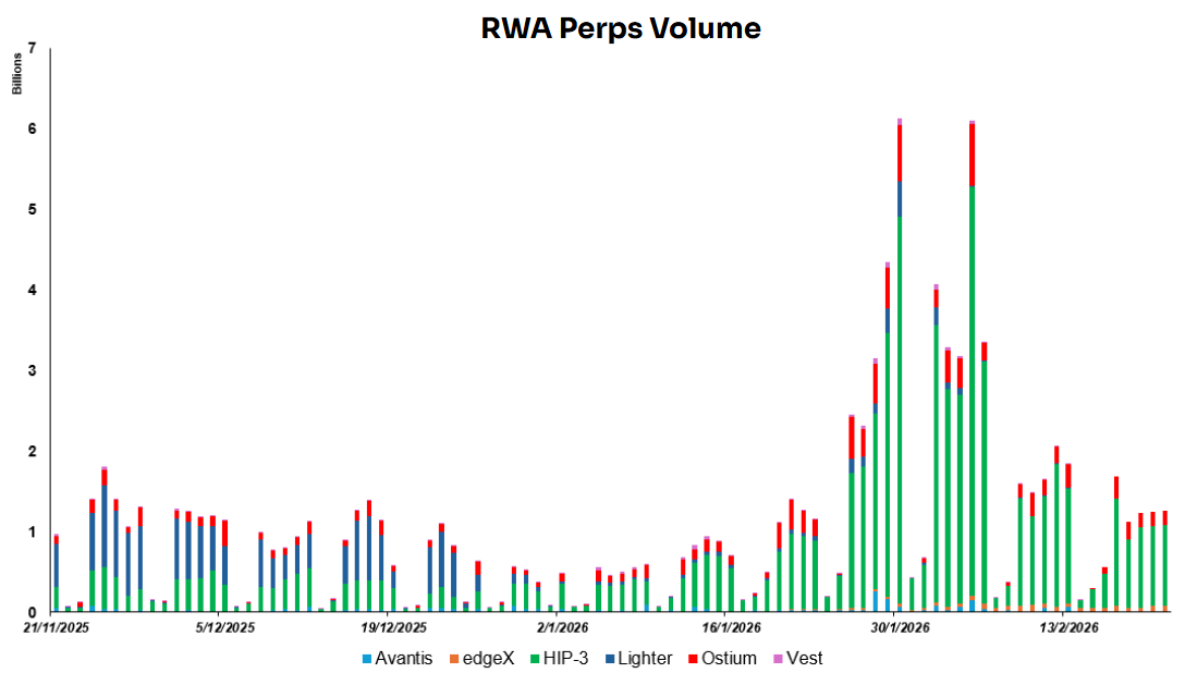 Atualmente, o volume diário de negociação de contratos perpétuos RWA on-chain situa-se entre 1,5–2,0 mil milhões $, com a maioria da atividade impulsionada por projetos do ecossistema Hyperliquid HIP-3, que normalmente representam mais de 60 % do volume total. Em comparação, o volume médio diário de ações dos EUA ronda 51,65 mil milhões $, enquanto o ouro registou um valor médio diário de negociação de cerca de 233 mil milhões $ em 2024. Isto evidencia que os derivados RWA on-chain continuam muito aquém dos mercados tradicionais em termos de liquidez, deixando amplo espaço para crescimento futuro. (12)