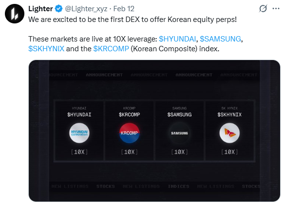Uma das principais vantagens dos mercados on-chain é a capacidade de abrir um gateway global de liquidez. Ativos anteriormente limitados por horários de negociação, acesso geográfico e canais de corretagem podem ser transformados em contratos padronizados negociáveis 24/7 por uma base global de utilizadores. Um exemplo claro é a Lighter, que lançou recentemente contratos perpétuos para várias ações coreanas. Isto proporciona aos investidores não locais uma forma de acesso mais acessível a mercados acionistas estrangeiros, expandindo significativamente a exposição transfronteiriça a ações.