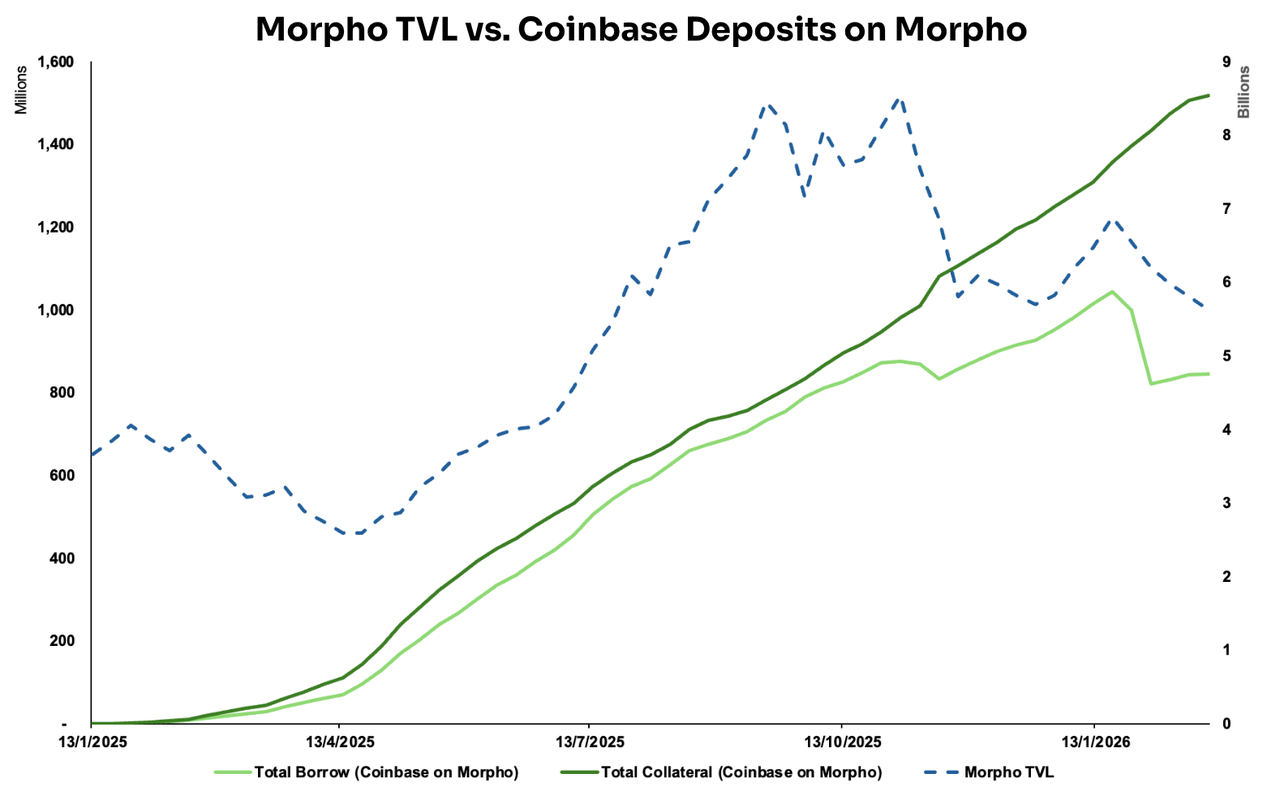 Após o lançamento da integração, o volume de colateral e empréstimos a fluir para a Morpho via canal Coinbase registou uma tendência de crescimento sustentada. Para a Morpho, os benefícios vão além do aumento do TVL. A parceria com a Coinbase confere credibilidade de distribuição e efeito de confiança: ao ser selecionada por uma plataforma mainstream como camada de infraestrutura, a fiabilidade e usabilidade percecionadas da Morpho são reforçadas. Isto facilita a atração de mais depositantes, curadores e integrações ao nível da aplicação, alimentando um ciclo de crescimento positivo.