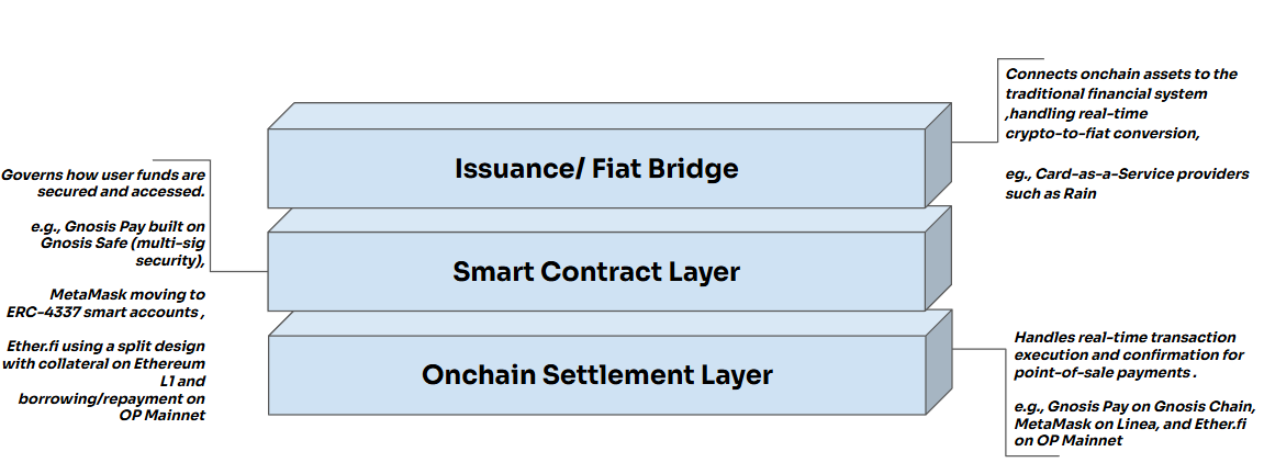 Camada de liquidação: Responsável por confirmações rápidas e de baixo custo on-chain em redes L2 para cenários de pagamento POS. Camada de contratos inteligentes: Gere fundos de forma segura e executa lógica, incluindo arquiteturas multisig, sistema de contas ERC-4337 e mecanismos de empréstimo colateralizado. Camada de emissão de cartões: Implementada via plataforma CaaS (Card-as-a-Service), permite conversão em tempo real de ativos cripto para fiat, ligando à infraestrutura bancária e redes de pagamento como Visa e Mastercard, viabilizando aceitação global por comerciantes. (15)