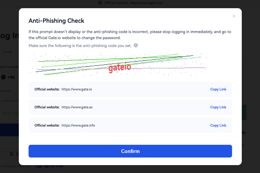 Após o login, uma janela de verificação anti-phishing aparecerá. Verifique se o código anti-phishing exibido é o mesmo que você configurou anteriormente. Se você não tiver configurado um código anti-phishing, recomendamos que faça isso (clique em "Verificação de Segurança" - "Gerenciamento de Senha" para definir o Código Anti-Phishing). Se o código exibido estiver correto, clique em "Confirmar".