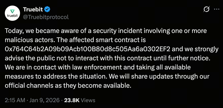 No dia 9 de janeiro, a Truebit publicou um comunicado oficial confirmando que seu protocolo foi alvo de um ataque malicioso recentemente. De acordo com dados da plataforma de análise on-chain Lookonchain, um endereço específico de smart contract—0x764C64b2A09b09Acb100B80d8c505Aa6a0302EF2—foi explorado, resultando na saída não autorizada de ativos.