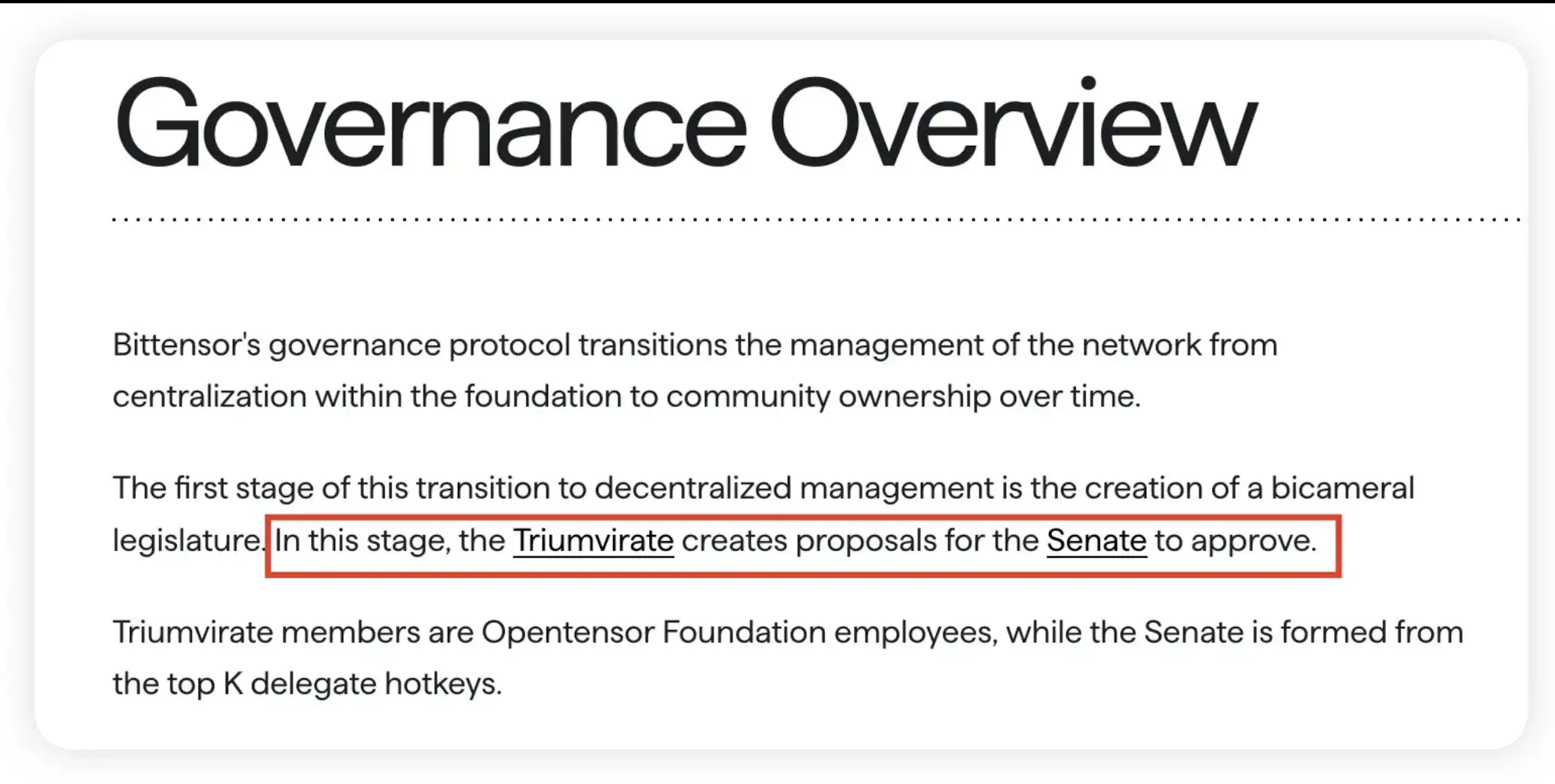 Quanto à chamada estrutura de governança binária “Big Three + Senate”, os três grandes são os três funcionários da Opentensor Foundation, e o Senado é o top 12 validadores, todos eles seus próprios funcionários ou partes interessadas.