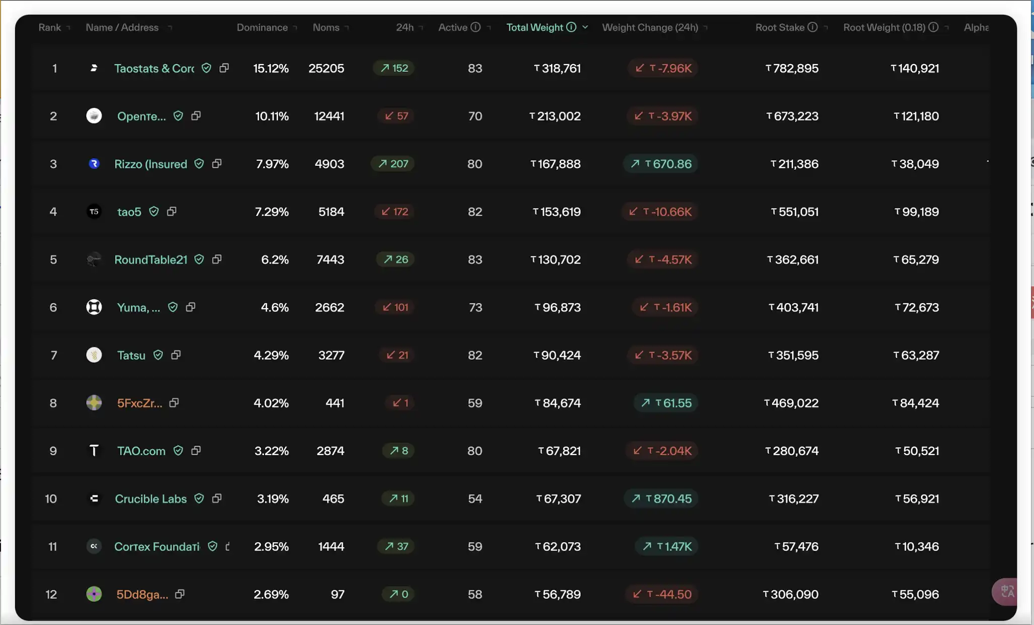 Como resultado, os proprietários de sub-redes não só não recebem nenhuma receita do modelo dTAO, mas até mesmo têm que subsidiá-la: criar receita externa e injetá-la em seus tokens alfa de sub-rede. Isso significa que tanto o projeto de sub-rede quanto os mineradores estão essencialmente trabalhando para validadores. Os validadores, como a classe privilegiada da rede Bittensor, não só são incapazes de fazer qualquer coisa de valor, mas também podem continuar a vender tokens alfa de sub-rede desde o início da atualização do dTAO, e o TAO que flui para a rede raiz é responsável por até 1/3 das emissões diárias.