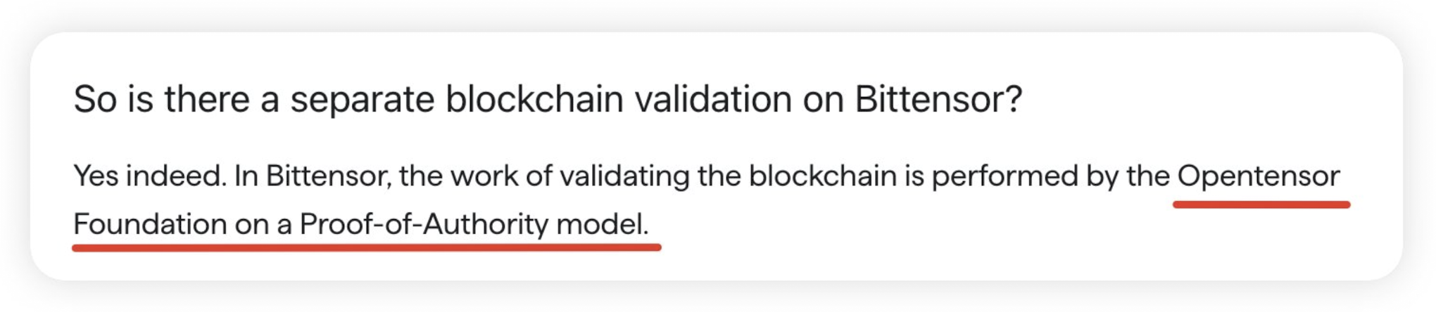 Em primeiro lugar, embora a Bittensor sempre tenha se anunciado oficialmente como um projeto de “mineração justa”, na verdade, o Subtensor subjacente não é uma cadeia pública PoW nem uma cadeia pública PoS. Em vez disso, é uma cadeia independente administrada pela Opentensor Foundation (fundação da Bittensor), e o mecanismo é muito caixa preta.