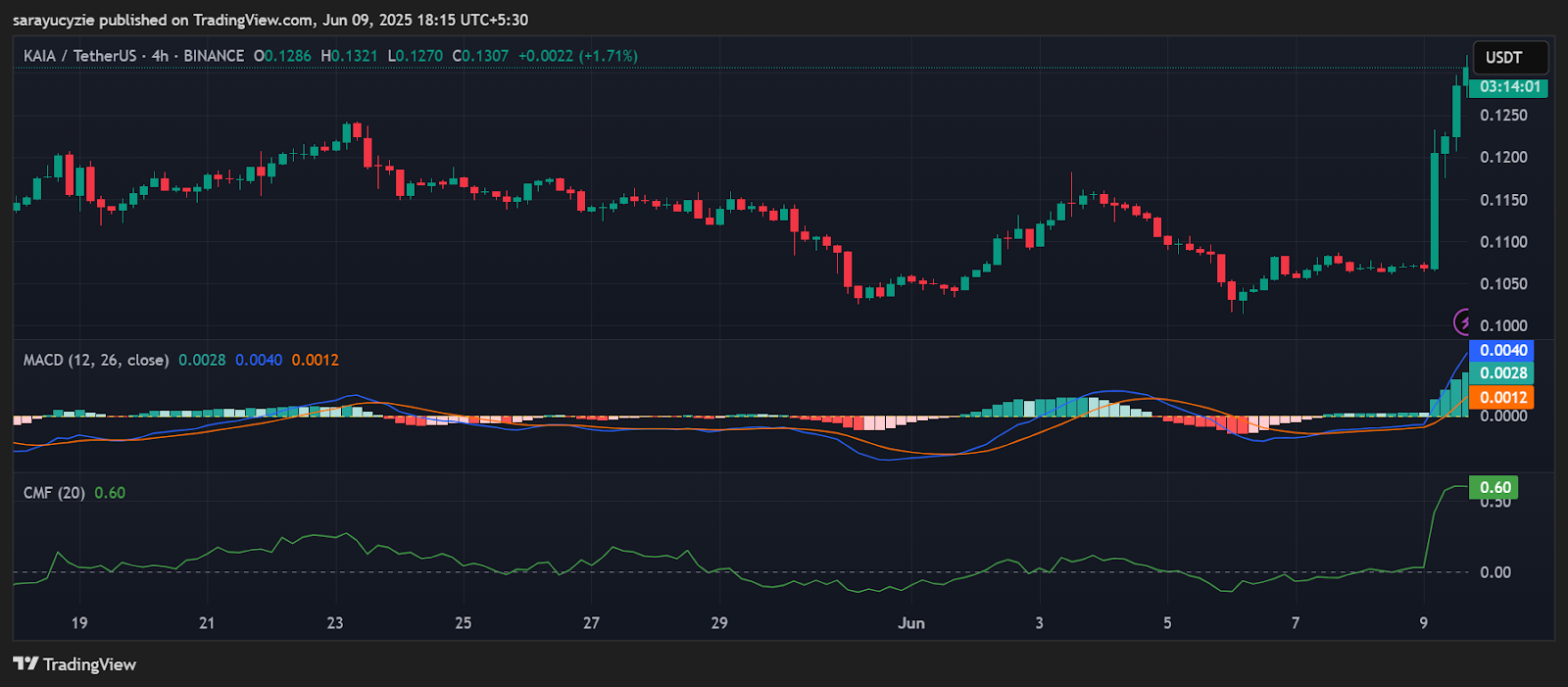 Além disso, a Divergência de Convergência da Média Móvel (MACD) linha do ativo cruzou acima da linha de sinal. Isso sugere um forte impulso de alta no mercado, com mais movimento de alta em andamento. Além disso, o indicador Chaikin Money Flow (CMF) de KAIA, encontrado em 0,60, indica forte pressão de compra e sentimento de alta, e o dinheiro está fluindo para o ativo, com potencial para mais tendência de alta.
