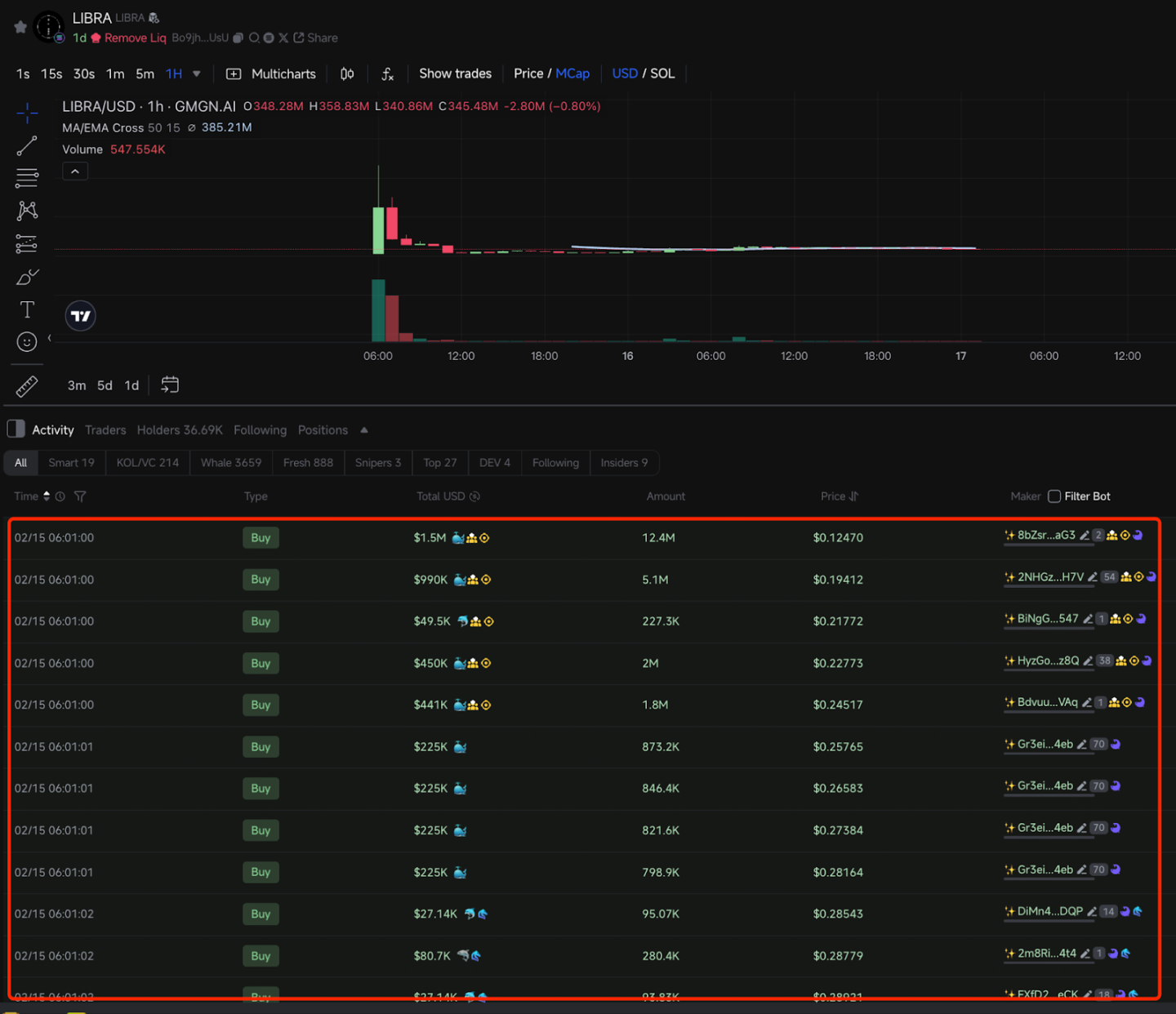 De acordo com dados da GMGN, quase US$ 4,5 milhões foram despejados em $LIBRA em apenas 2 segundos após sua abertura.
