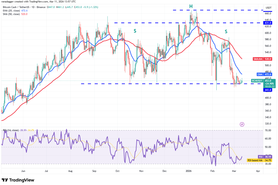 Gráfico diário do BCH/USDT | Fonte: TradingView A EMA de 20 dias em declínio (472 USD) e o RSI na zona negativa indicam que os ursos ainda controlam o mercado. Se o preço do BCH cair forte a partir da EMA de 20 dias, a probabilidade de romper o suporte em 443 USD aumenta. Nesse cenário, o padrão de cabeça e ombros de baixa será concluído, abrindo caminho para uma queda até 375 USD.