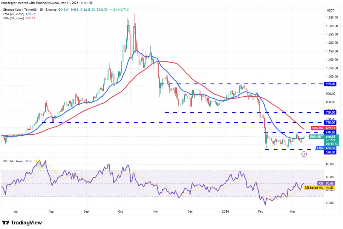Gráfico diário do BNB/USDT | Fonte: TradingView A EMA de 20 dias (635 USD) está lateral e o RSI está próximo do nível médio, sugerindo equilíbrio entre oferta e procura. Os compradores precisam empurrar o preço acima da SMA de 50 dias em 689 USD para ganhar vantagem. Nesse cenário, o BNB/USDT pode subir para 730 USD e depois para 790 USD, onde espera-se resistência forte dos ursos.