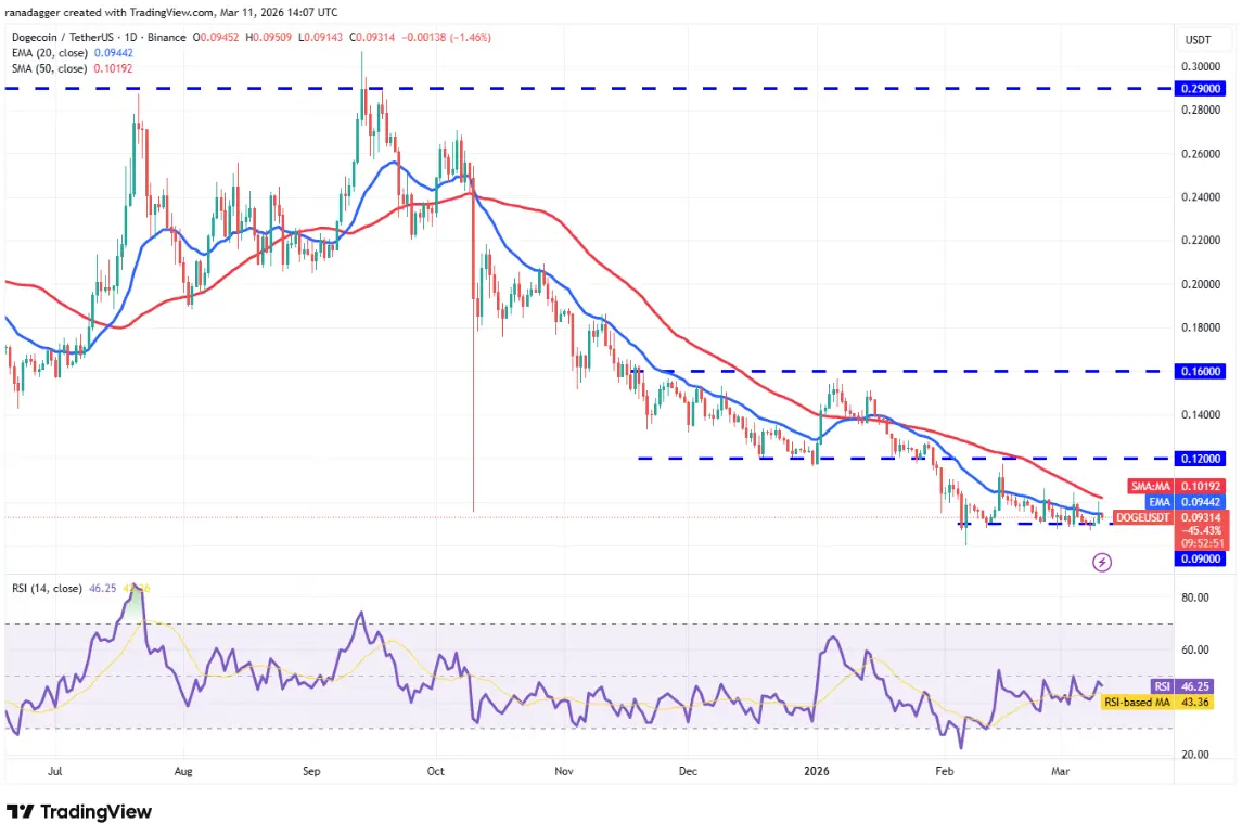 O Dogecoin (DOGE) subiu até a SMA de 50 dias em 0,10 USD na terça-feira, mas os touros não conseguiram romper a resistência.