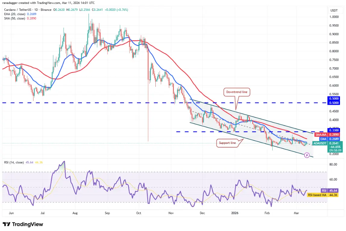 Gráfico diário do XRP/USDT | Fonte: TradingView A EMA de 20 dias está aplanando-se lentamente e o RSI está logo abaixo do nível médio, indicando que a pressão de venda está a diminuir. Os compradores tentarão impulsionar o preço do XRP acima das médias móveis, abrindo caminho para uma alta até a linha de tendência de baixa do canal descendente.