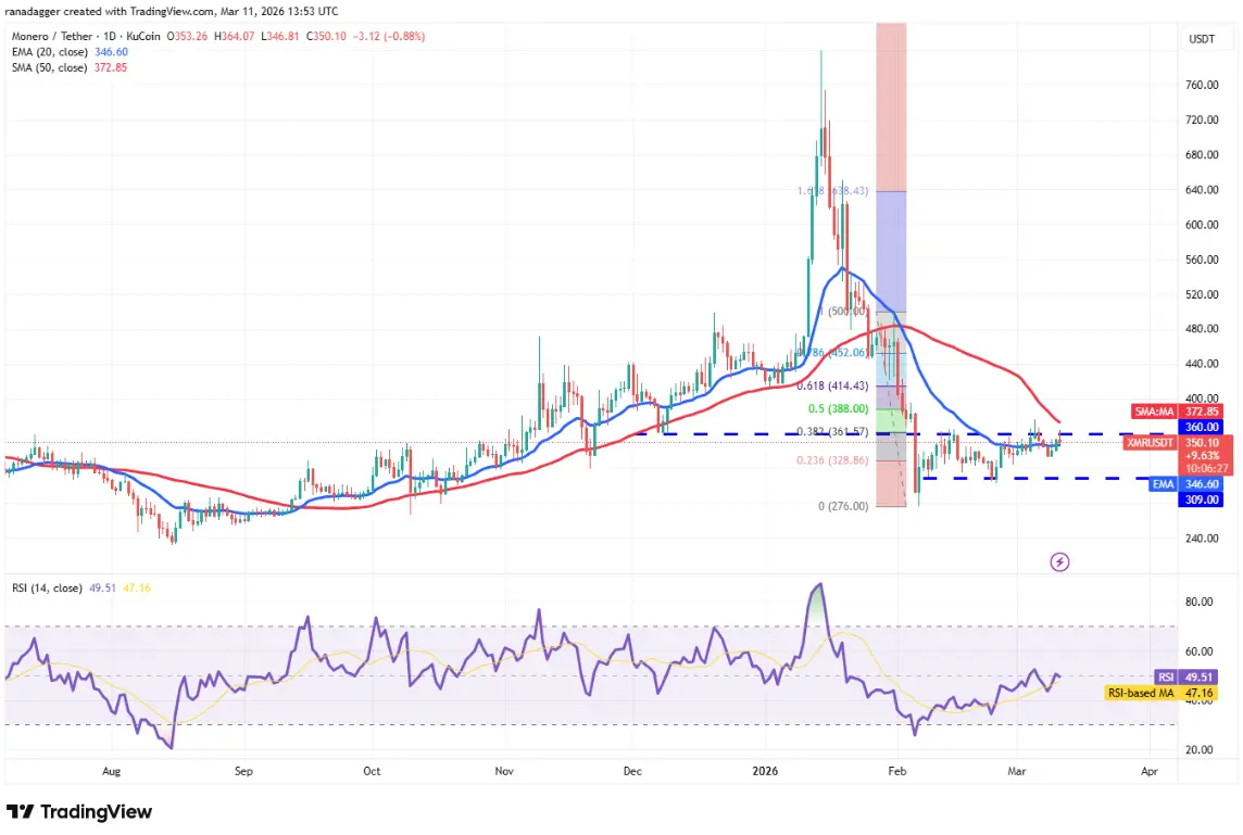 Gráfico diário do XMR/USDT | Fonte: TradingView A EMA de 20 dias está lateral em 346 USD e o RSI próximo do nível médio, indicando que ainda não há um lado claramente dominante. Se os touros conseguirem empurrar o preço do XMR acima da SMA de 50 dias, o par pode acelerar até o nível de retração de Fibonacci de 61,8% em 414 USD, e posteriormente até 452 USD.