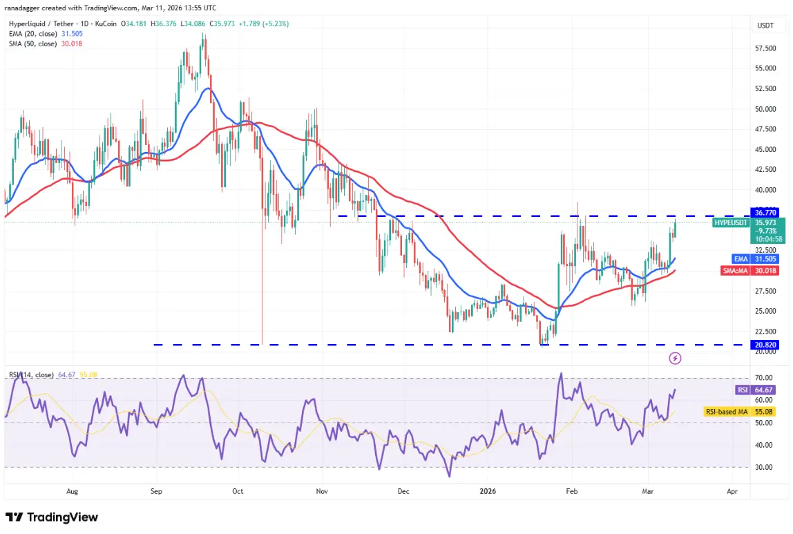 Gráfico diário do HYPE/USDT | Fonte: TradingView A EMA de 20 dias (31,50 USD) começou a subir e o RSI está na zona positiva, sugerindo que a tendência mais favorável atualmente é de alta. Os touros tentarão empurrar o preço do HYPE acima da resistência em 36,77 – 38,42 USD. Se tiverem sucesso, o HYPE/USDT pode subir para 43 USD e depois para 50 USD.