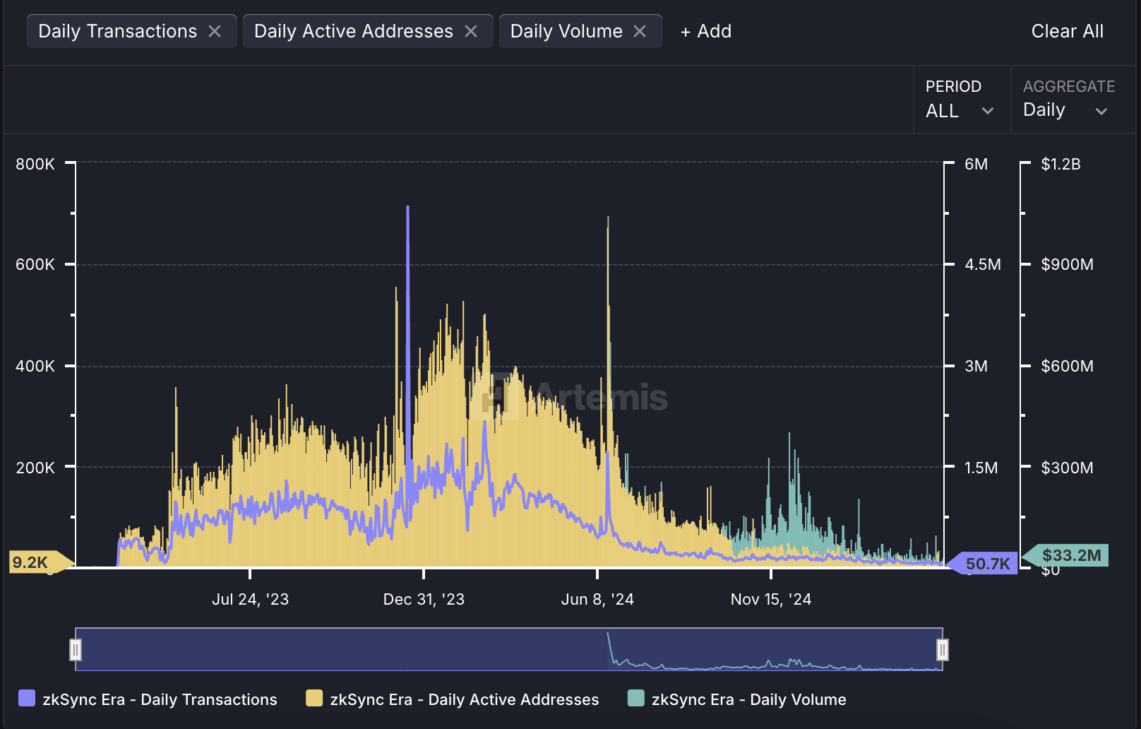 Ao mesmo tempo, os dados da Artemis também mostram que, até 21 de abril, o número de endereços ativos diários do ZKsync caiu drasticamente de 445.000, seu pico, para apenas 9.200, uma queda de mais de 97%. No mesmo período, o número de transações diárias também caiu de 5,2 milhões, seu ponto histórico mais alto, para 50.700, enquanto o volume de transações caiu de mais de 770 milhões de dólares para agora 3,32 milhões de dólares, uma queda de mais de 95%.