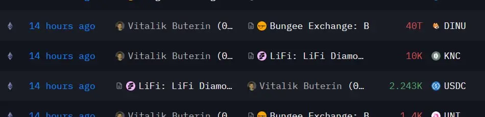 Juntamente com a DEX, Buterin também vendeu 10.000 KNC e 40 trilhões de tokens DINU, obtendo 16.796 USDC.