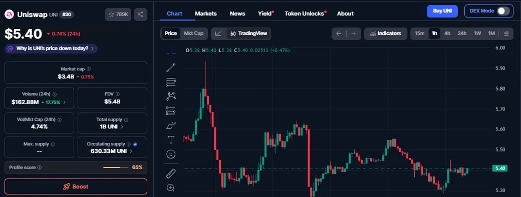 O UNI oscila em torno de $5.40 após uma ligeira queda de 0.87% nas últimas 24 horas.