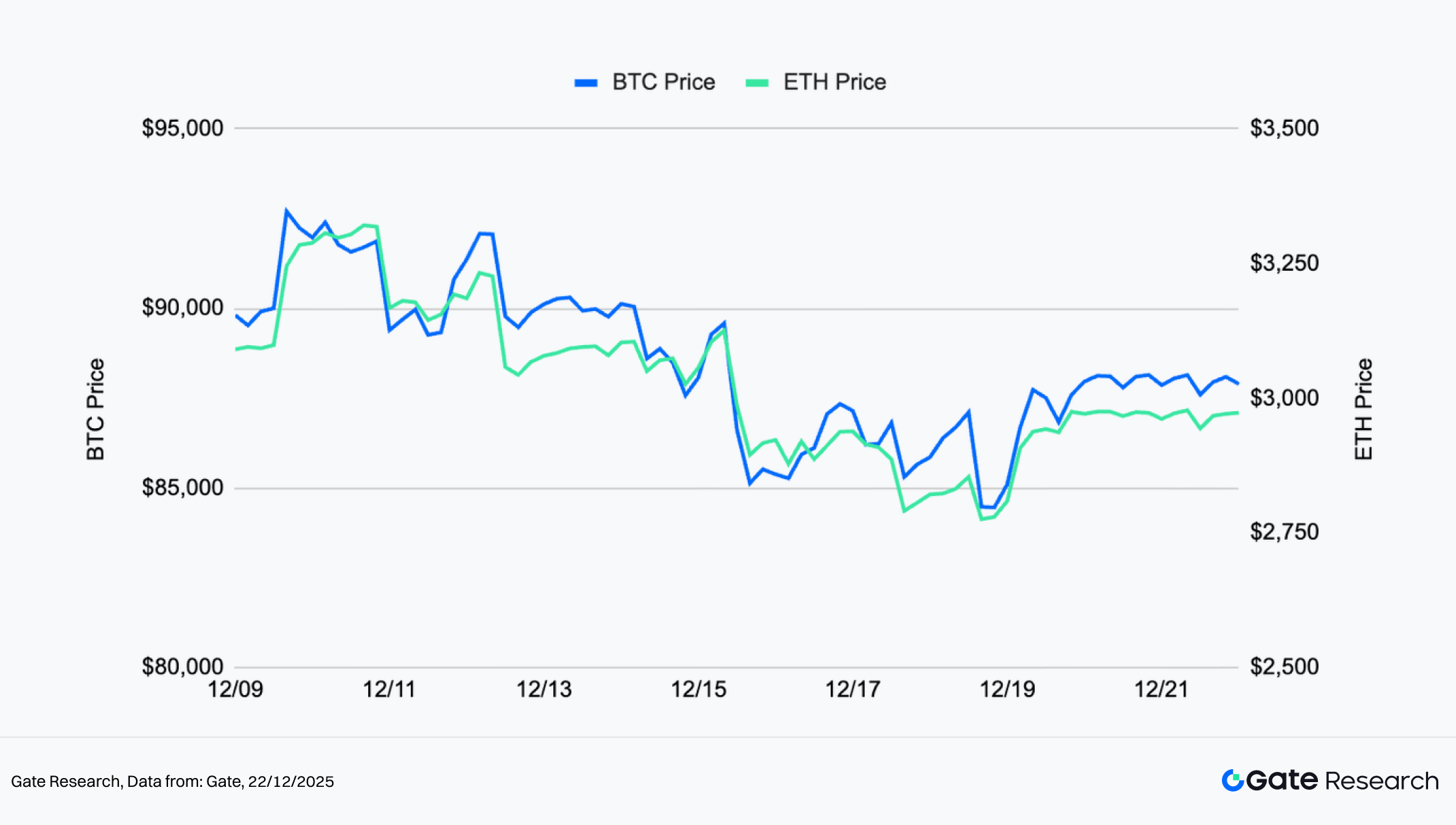 De acordo com a CoinGecko, entre 9 e 22 de dezembro, BTC e ETH registaram uma recuperação ténue após uma fase de descida volátil, com os preços a situarem-se claramente abaixo dos máximos anteriores e o sentimento geral do mercado a manter-se cauteloso. O BTC tentou inicialmente romper em alta, mas rapidamente recuou e entrou numa consolidação instável; várias tentativas de recuperação foram travadas pela resistência superior, sem inverter a tendência de forma significativa, mantendo-se num intervalo técnico inferior. O ETH seguiu em grande parte o percurso do BTC, mas com uma inclinação descendente mais acentuada. Durante a descida, o ETH quebrou sucessivos suportes de curto prazo, e as recuperações subsequentes foram menos expressivas, evidenciando um desempenho inferior ao do BTC.【1】【2】【3】