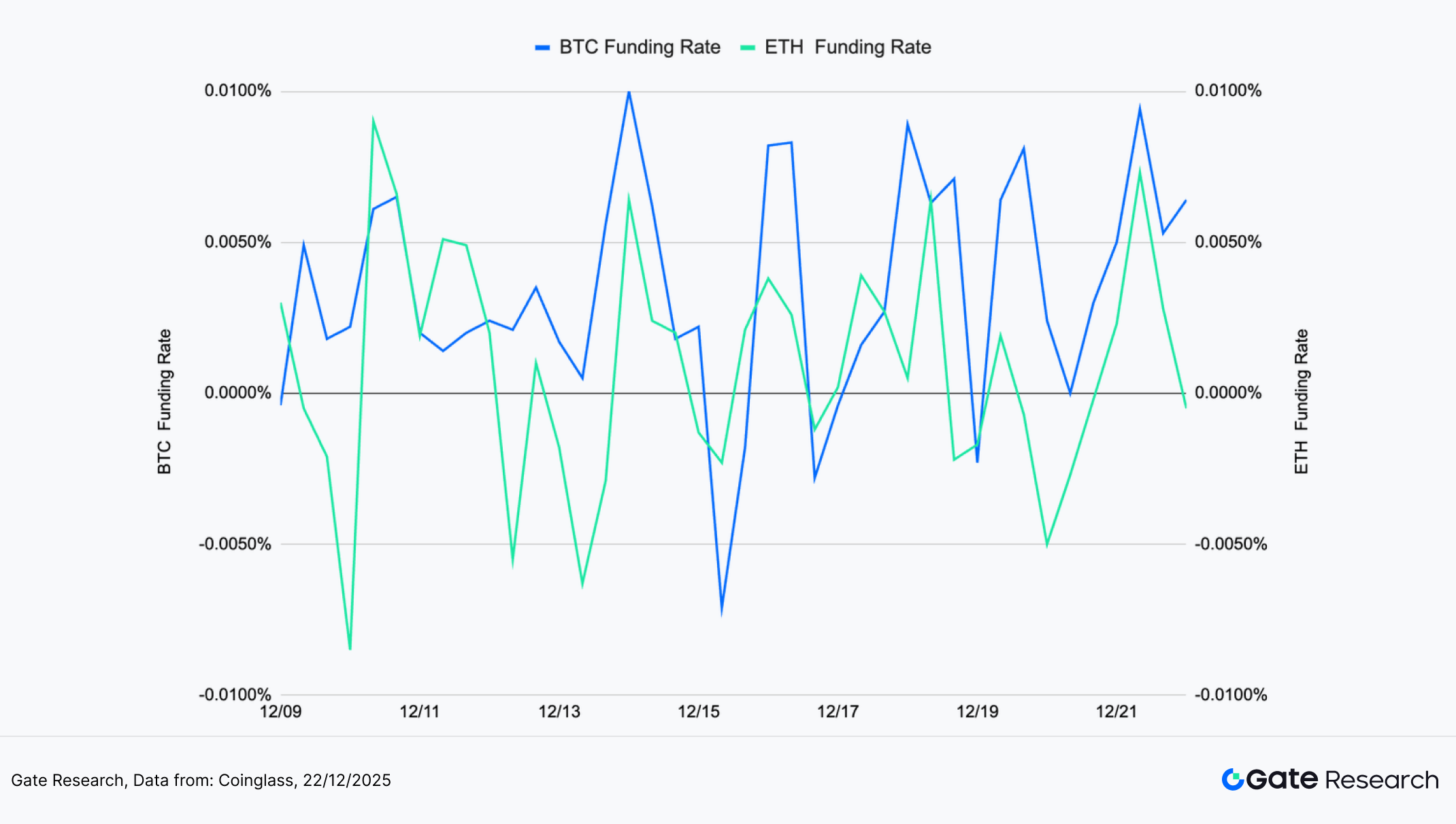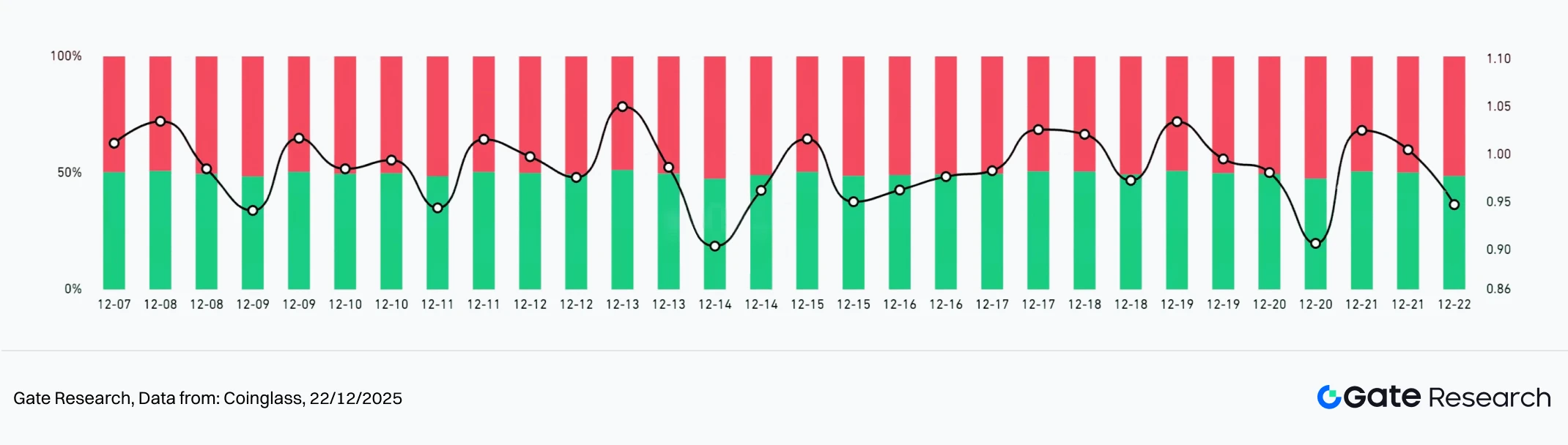 Segundo a Coinglass, entre 9 e 22 de dezembro, o LSR de BTC e ETH oscilou em torno de 1,0, sem tendência persistente, indicando que o capital alavancado está focado em negociações de curto prazo e especulação em intervalo, e não em posicionamentos de tendência. A dinâmica do LSR reflete rotatividade frequente do sentimento, em vez de acumulação de alavancagem direcional.【5】