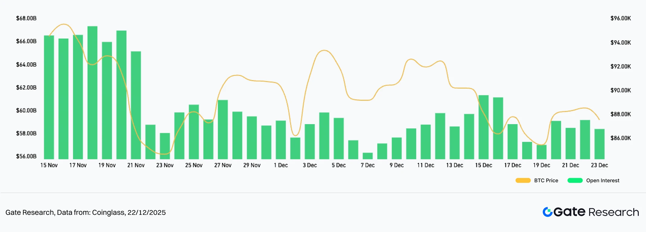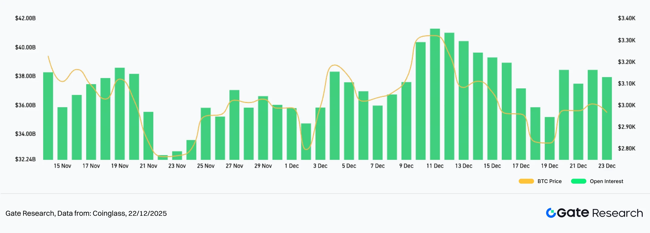 Para apresentar de forma sistemática o comportamento do capital e as alterações estruturais no mercado de criptomoedas, este relatório analisa cinco dimensões essenciais: volatilidade dos preços do Bitcoin e Ethereum, rácio long–short (LSR), volume de posições abertas em futuros, taxas de financiamento e dados de liquidação. Estes indicadores abrangem tendências de preços, sentimento de mercado e condições de risco, oferecendo uma visão global da intensidade de negociação e das características estruturais do mercado. As secções seguintes detalham os desenvolvimentos mais recentes de cada métrica desde 9 de dezembro: