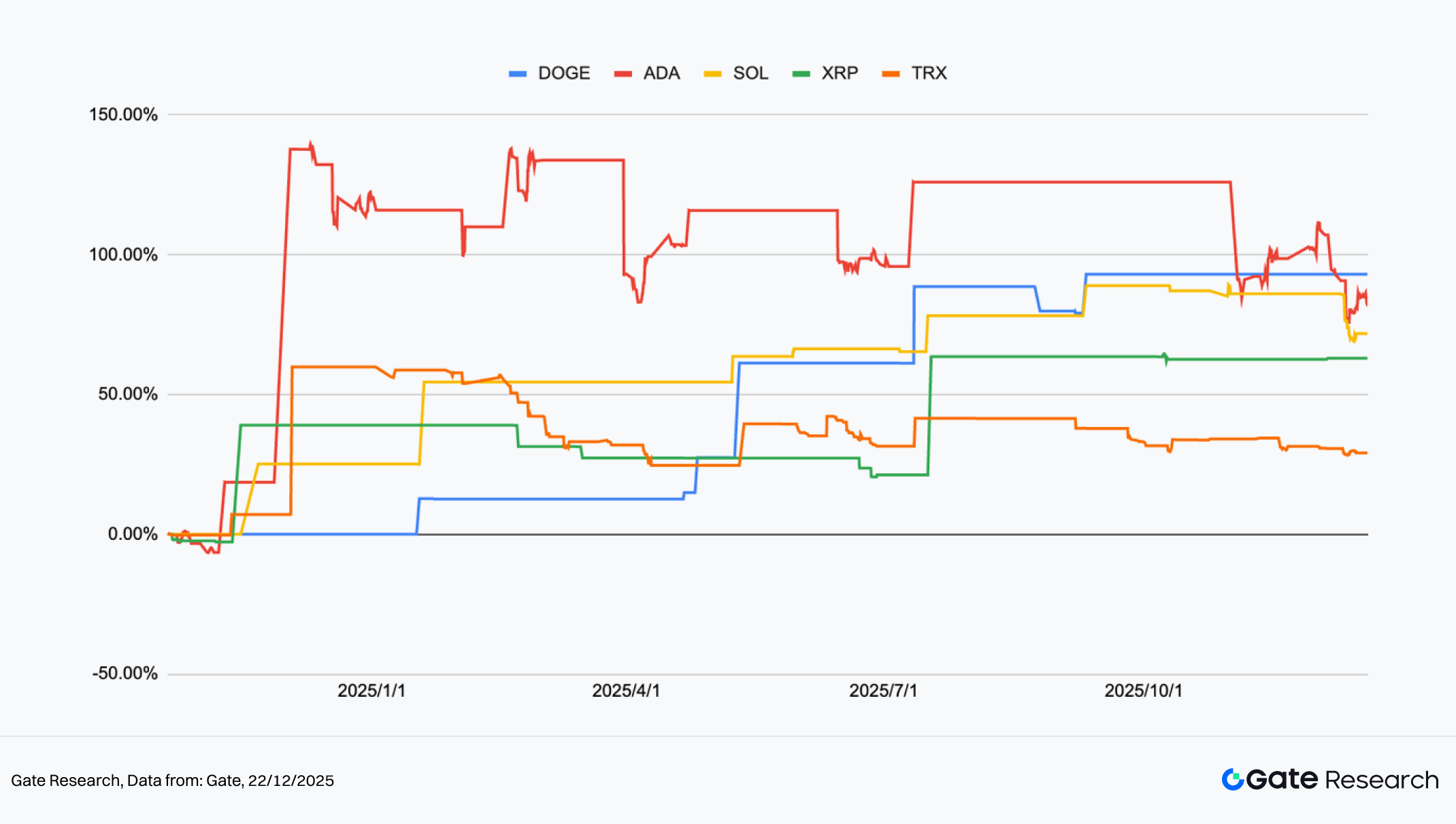 A estratégia de tendência com médias móveis densas utiliza a expansão direcional pós-convergência das médias móveis de curto e médio prazo como gatilho central de entrada, com escalonamento de posições e realização dinâmica de lucro para acumular retornos após confirmação da tendência. Nos backtests do último ano, DOGE, ADA e SOL registaram múltiplos inícios de tendência após estruturas densas, com retornos acumulados ascendentes. ADA e DOGE ultrapassaram os 100% em vários momentos, SOL manteve valorização constante, indicando robustez em ambientes de elevada volatilidade e tendência moderada. XRP e TRX negociaram maioritariamente em intervalo; quando surgiram tendências, proporcionaram retornos positivos estáveis, contribuindo para a diversificação da carteira.